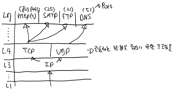 - L7와 같이 상위계층 프로토콜을 이용하기 위해 지켜져야 하는 전송 프로토콜(TCP/UDP)