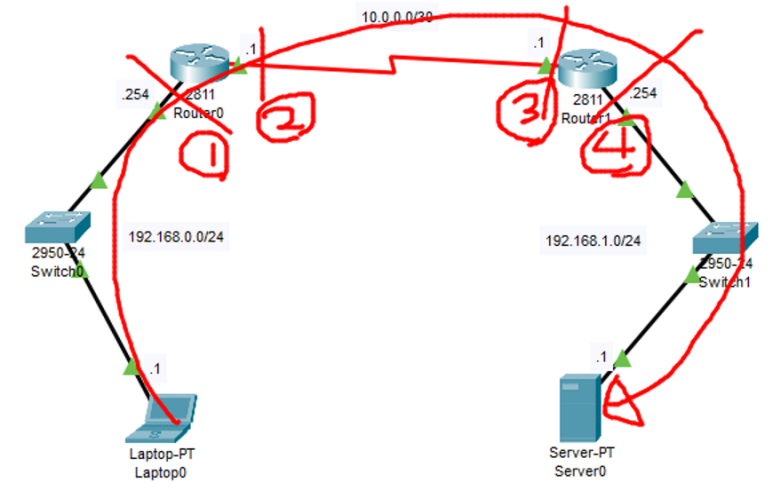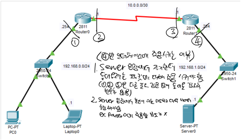 (라우팅 시 패킷트레이서는 ip route [아이피 대역] [서브넷마스크] [다음 홉의 ip] 형식으로 써야 함, 나가야 하는 방향 인터페이스는 명령어 지원 x)