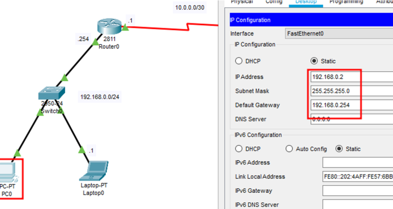ip route 192.168.0.0 255.255.255.0 10.0.0.1