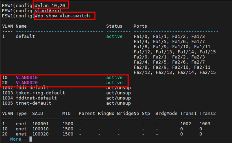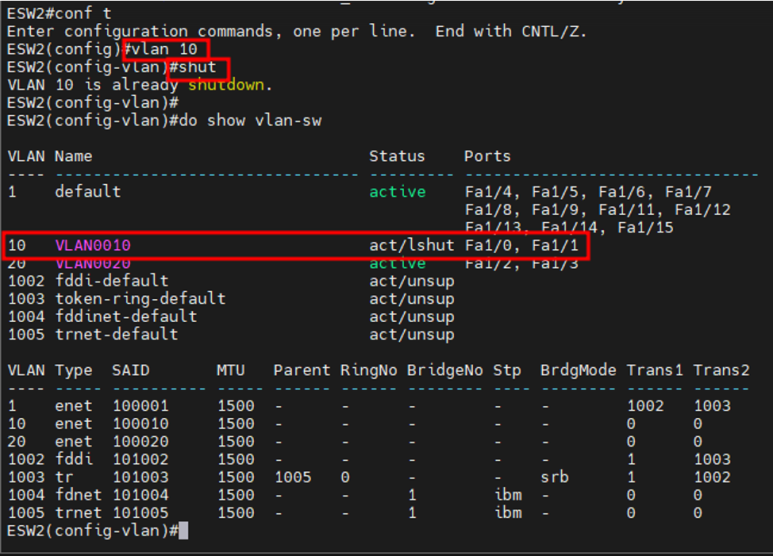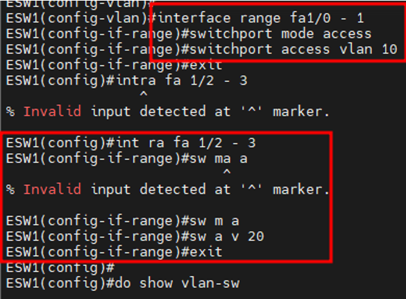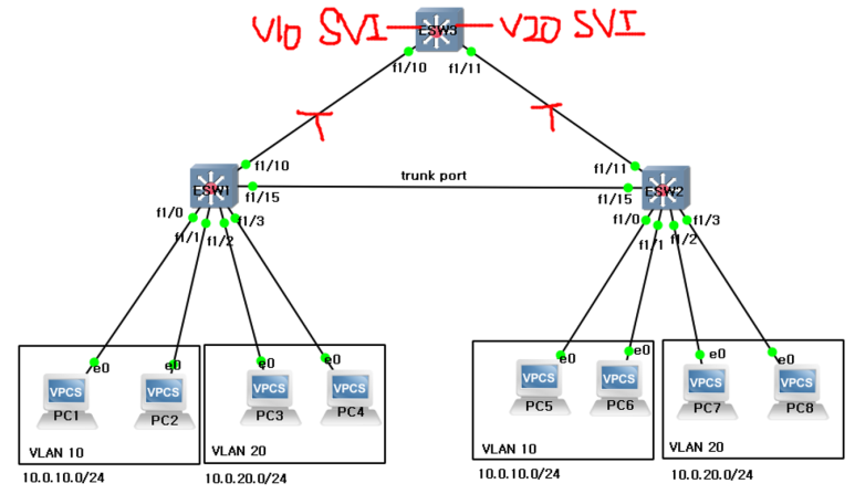 -> 어차피 ESW1과 ESW3의 fa1/10 연결 라인을 trunk 설정해야 vlan 10, 20이 지나가야 함