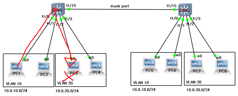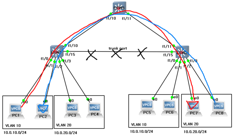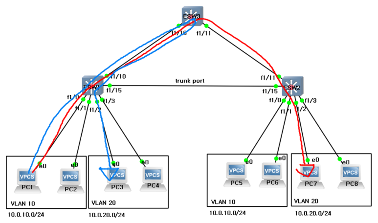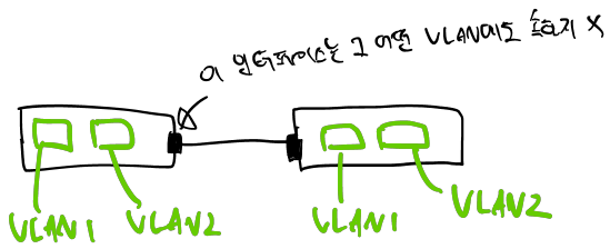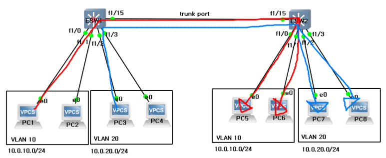 같은 vlan이더라도 물리적으로 스위치가 달라서 통신이 안됨(vlan 10: 빨간라인, vlan 20: 파란라인)