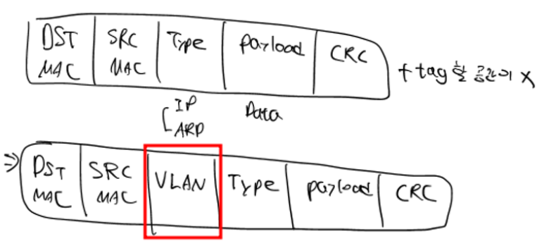 VLAN 정보(tag)를 담기 위해 4byte의 공간을 추가해서 다시 생성함