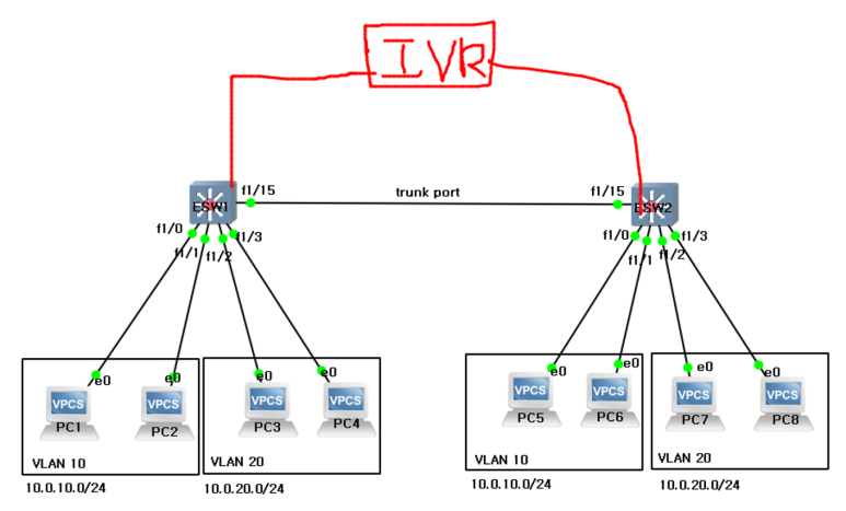 ESW1은 두 VLAN을 분리하는 역할만 함, 다른 네트워크끼리 통신이 되도록 하려면 vlan을 나눠준 스위치 위에 L3 기능이 있는 장비를 두고 연결시켜줘야 함(IVR 장비, Inter VLAN Router)