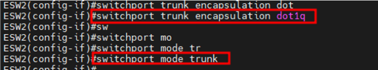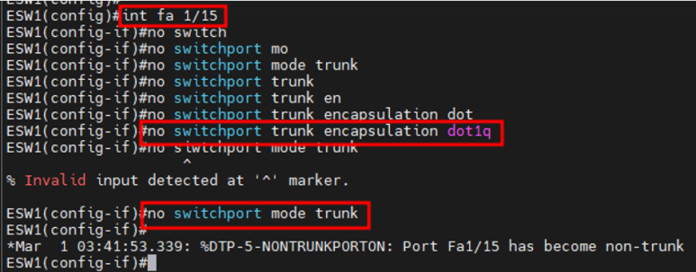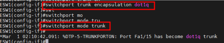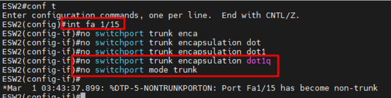 ESW1의 fa 1/15를 encapsulation(캡슐화) 방식을 dot1q로 trunk port 설정