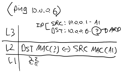 L3에서 도착지의 ip인 10.0.0.6/24의 MAC주소를 알아와서 해당 정보를 같이 L2로 보내줌, 그래야 L2 내려가서 패킷을 뜯어볼 때 도착지 MAC을 알 수 있음