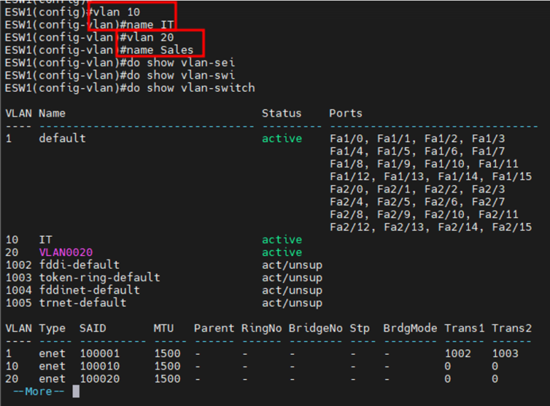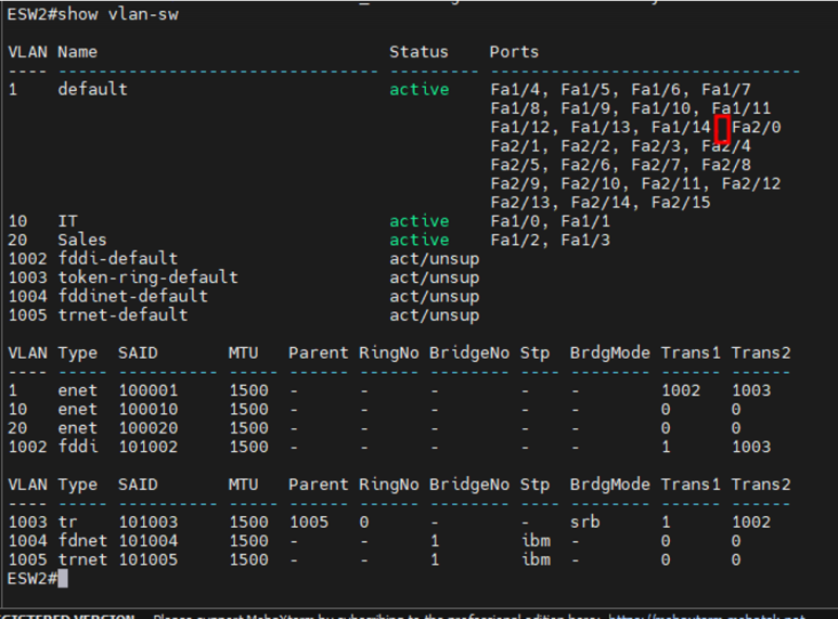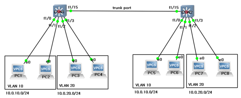 -> ESW1의 fa1/15와 ESW2의 fa1/15 라인을 trunk port로 설정해야 함(trunk port는 그 어떤 vlan에도 속하지 않으니 다양한 vlan이 지나다닐 수 있음)