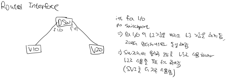 -> 실제 물리적인 포트 스위치 포트를 (config)#no switchport 명령어로 스위치 기능을 끄고 라우팅 기능만 살아 있도록 하는 것