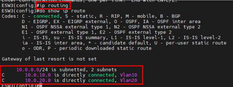 ESW3(IVR)에 SVI(int vlan 10, 20)를 만들려면 두가지 조건이 충족되어야 하는데