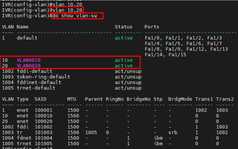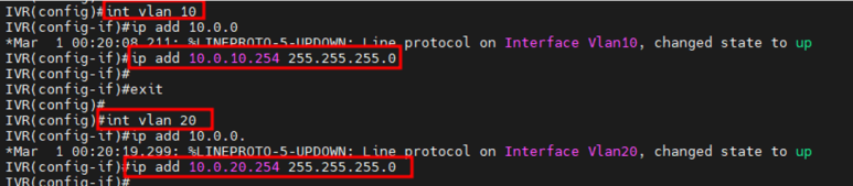IVR에서 SVI 생성을 위한 vlan 10,20 생성