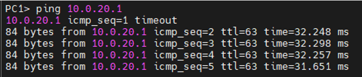 다른 VLAN을 찾아가야하는 VLAN 20으로는 게이트웨이를 찾아서 나가야하는데, 게이트웨이를 찾으러가는 패킷이 캡처되지 않음