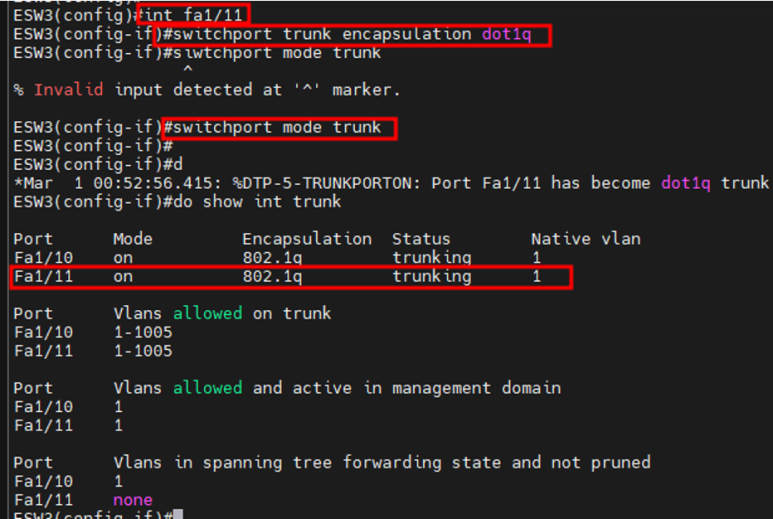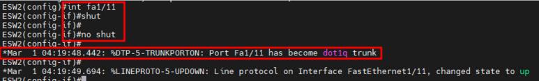 ESW2와 ESW3의 f1/11 포트의 trunk 설정을 해주자