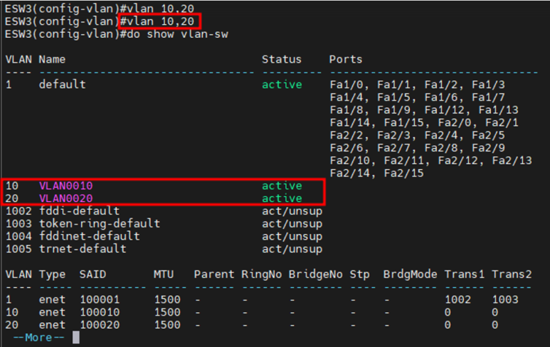 ( (config)# vlan 10,20 )