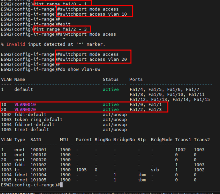 인터페이스를 범위로 한번에 지정하고, access 모드로 설정 후 해당 인터페이스(access port)를 vlan을 할당함