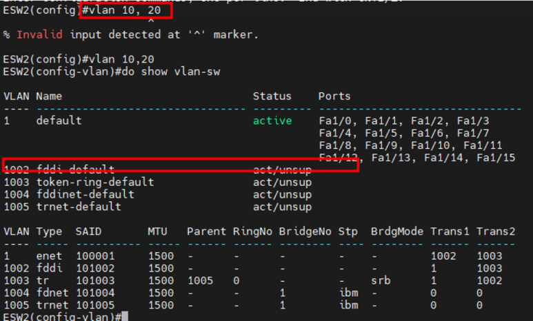 ESW1과 ESW2의 trunk port 라인이 vlan 10으로 access port 되어 있어서 vlan 10과 vlan 20의 통신이 안됨(vlan 10 길로 설정하면, vlan 20번은 못감)
