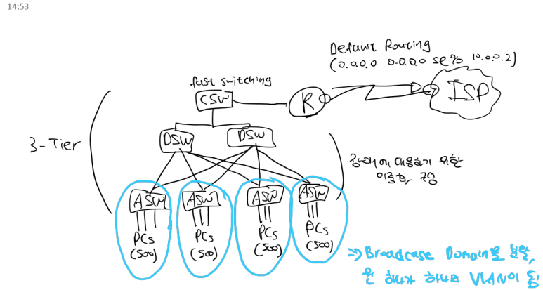 -- 라우팅 기능이 있는 L3 스위치를 통해 라우팅의 효과를 냄