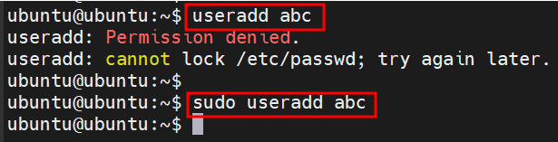 sudo 명령으로 useradd abc의 명령이 수행됨(관리자 권한을 일시적으로 획득해서)