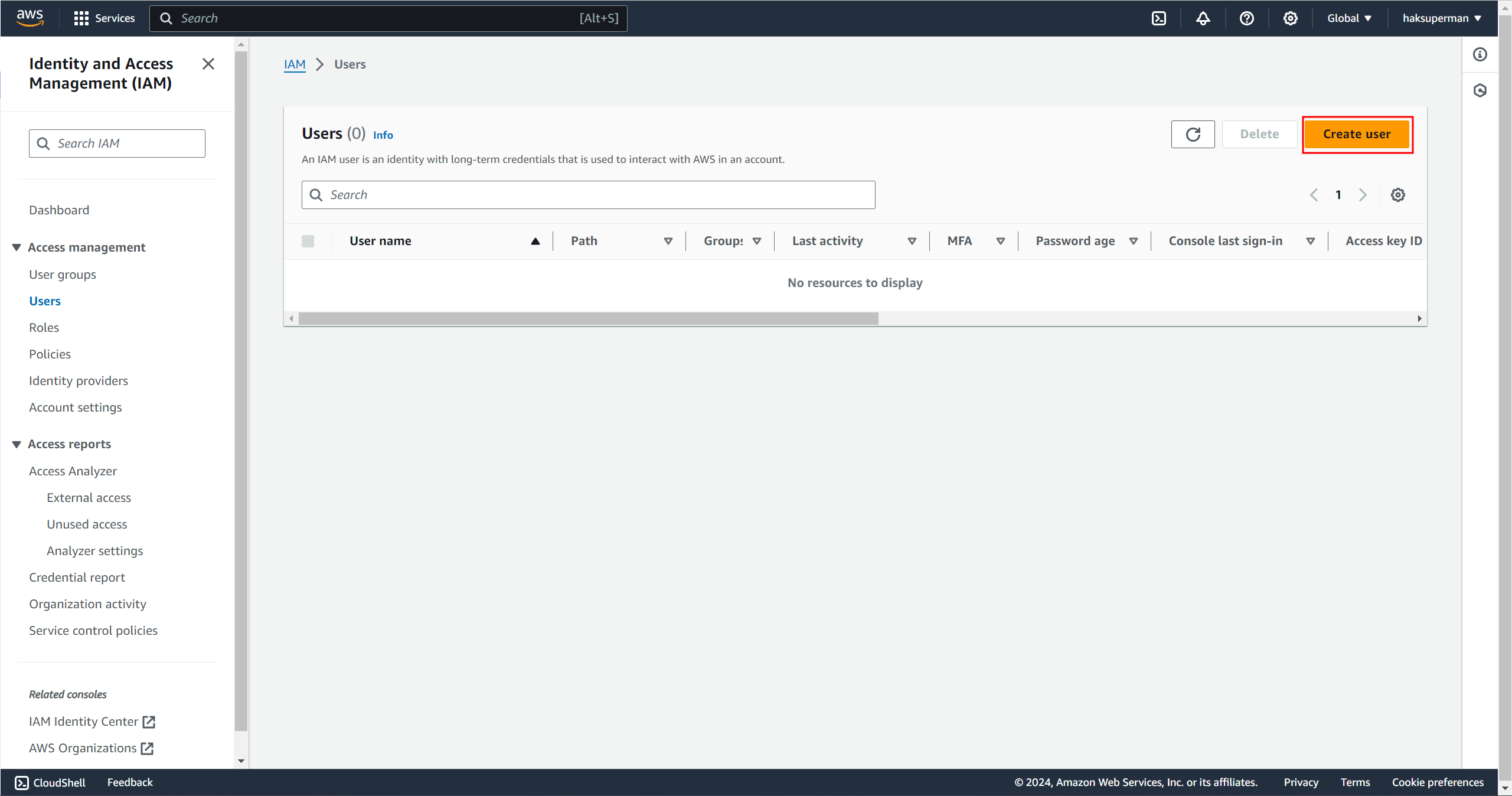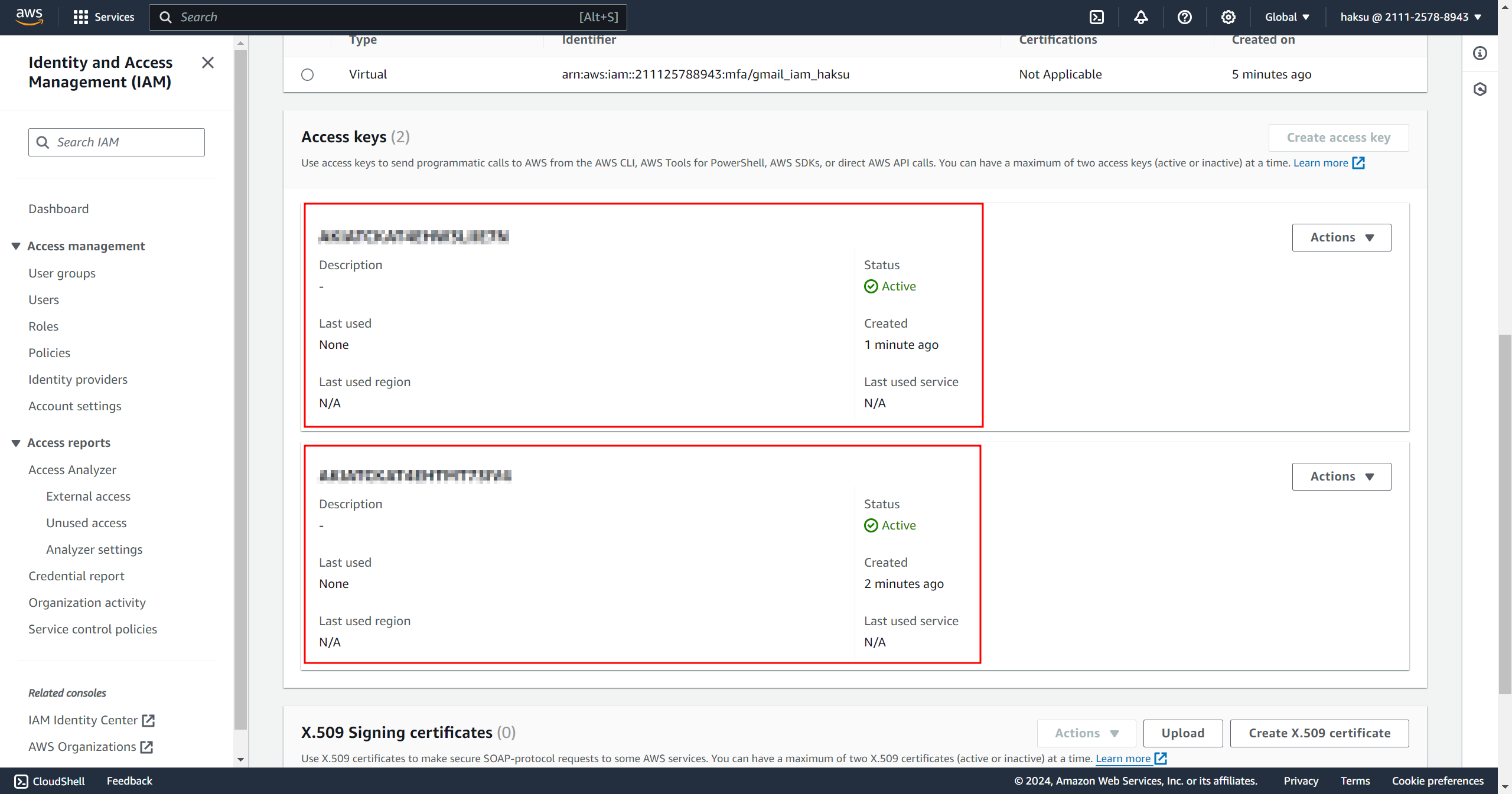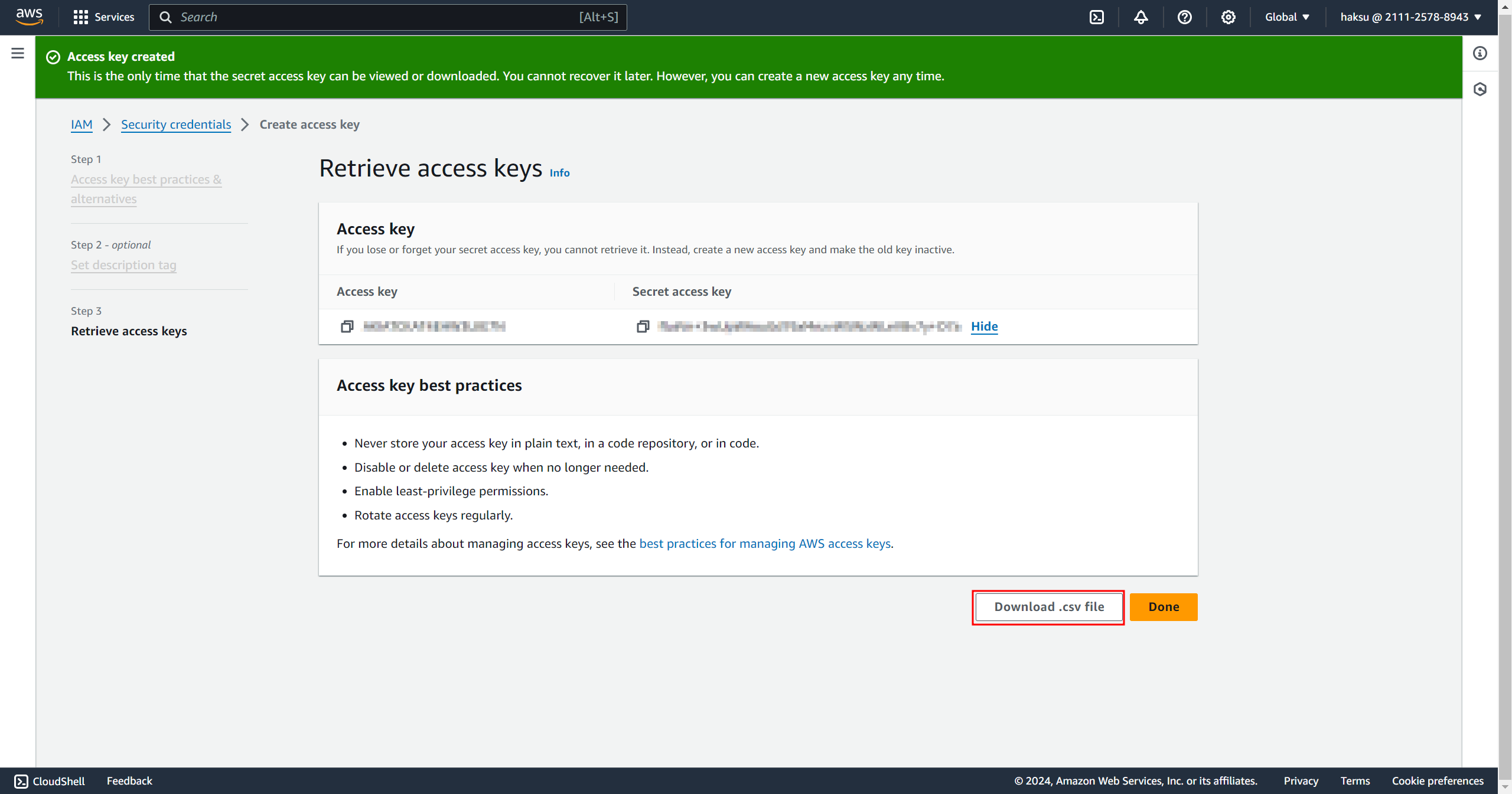 Access key와 Secret access key는 추후 다시 확인할 수 없다! (적어도 내 얕은 지식으로는...)