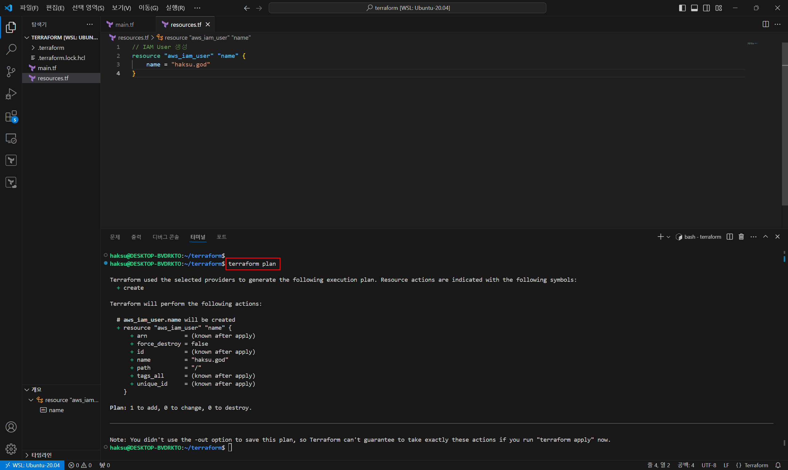 | terraform plan | dry-run(테스트) - 현재 상태 파일 확인 - 설정 파일(.tf) 읽고 파싱 - 현재 상태와 설정 파일의 상태 비교 - 변경 사항 요약 출력 |