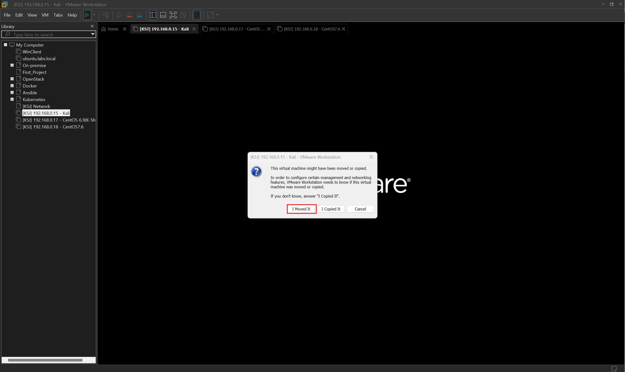 - I Moved It : VMware는 가상 머신이 다른 위치로 이동되었다고 가정하고, 가상 머신의 기존 설정을 유지