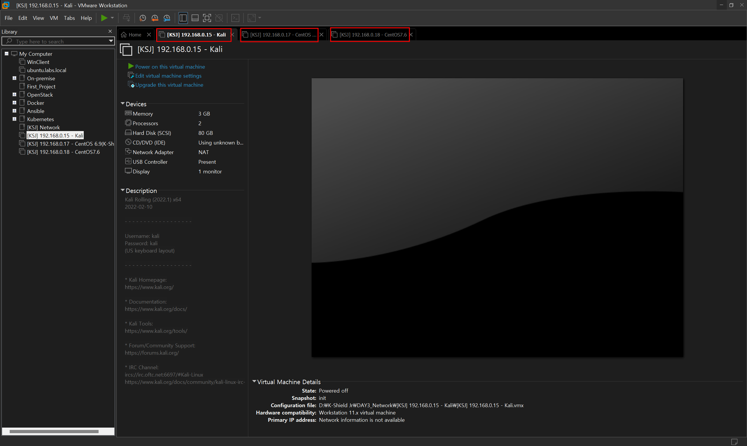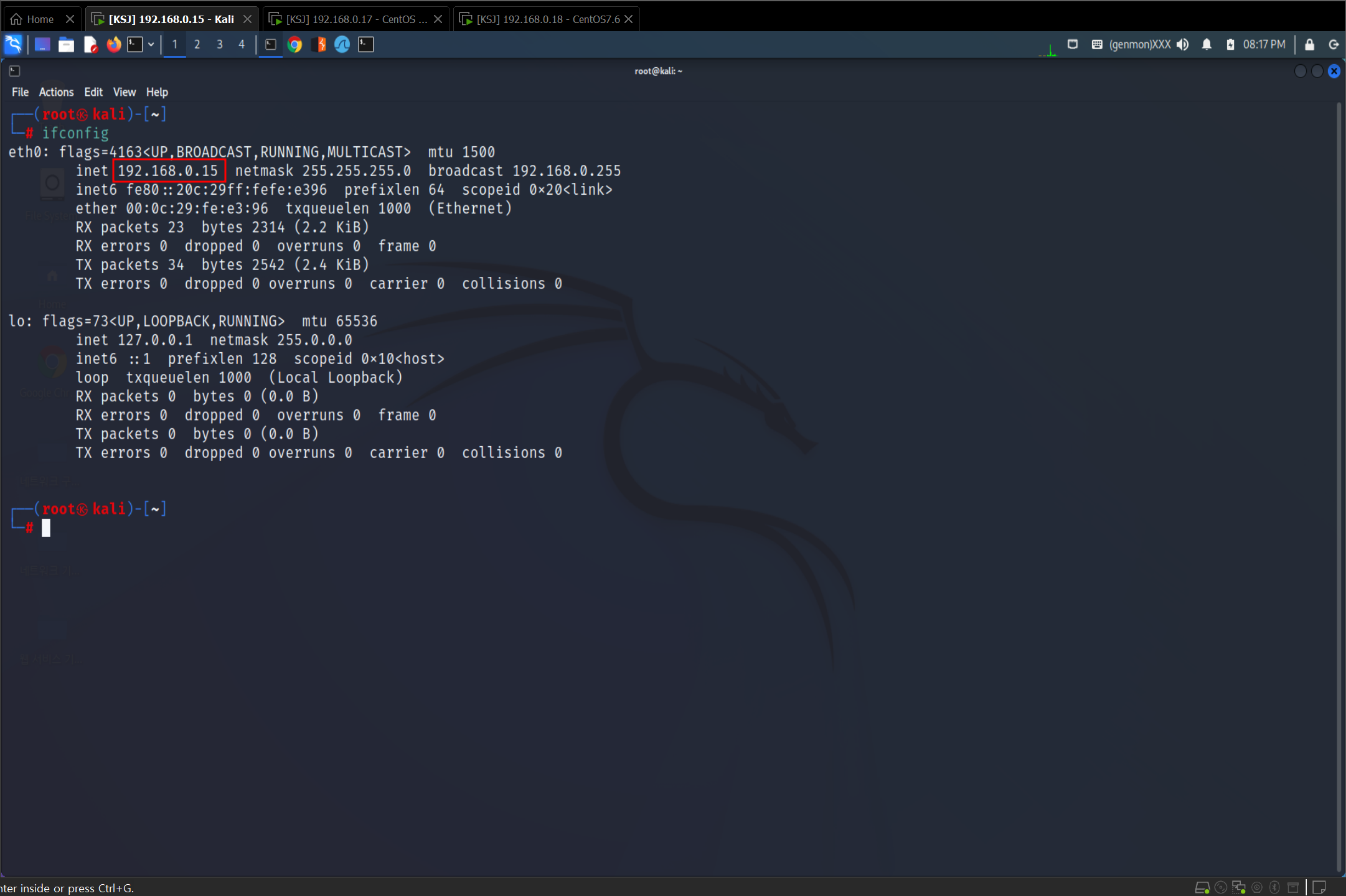 3. 각 가상 머신(Kail, CentOS 6.9, CentOS 7) 내부 IP 확인