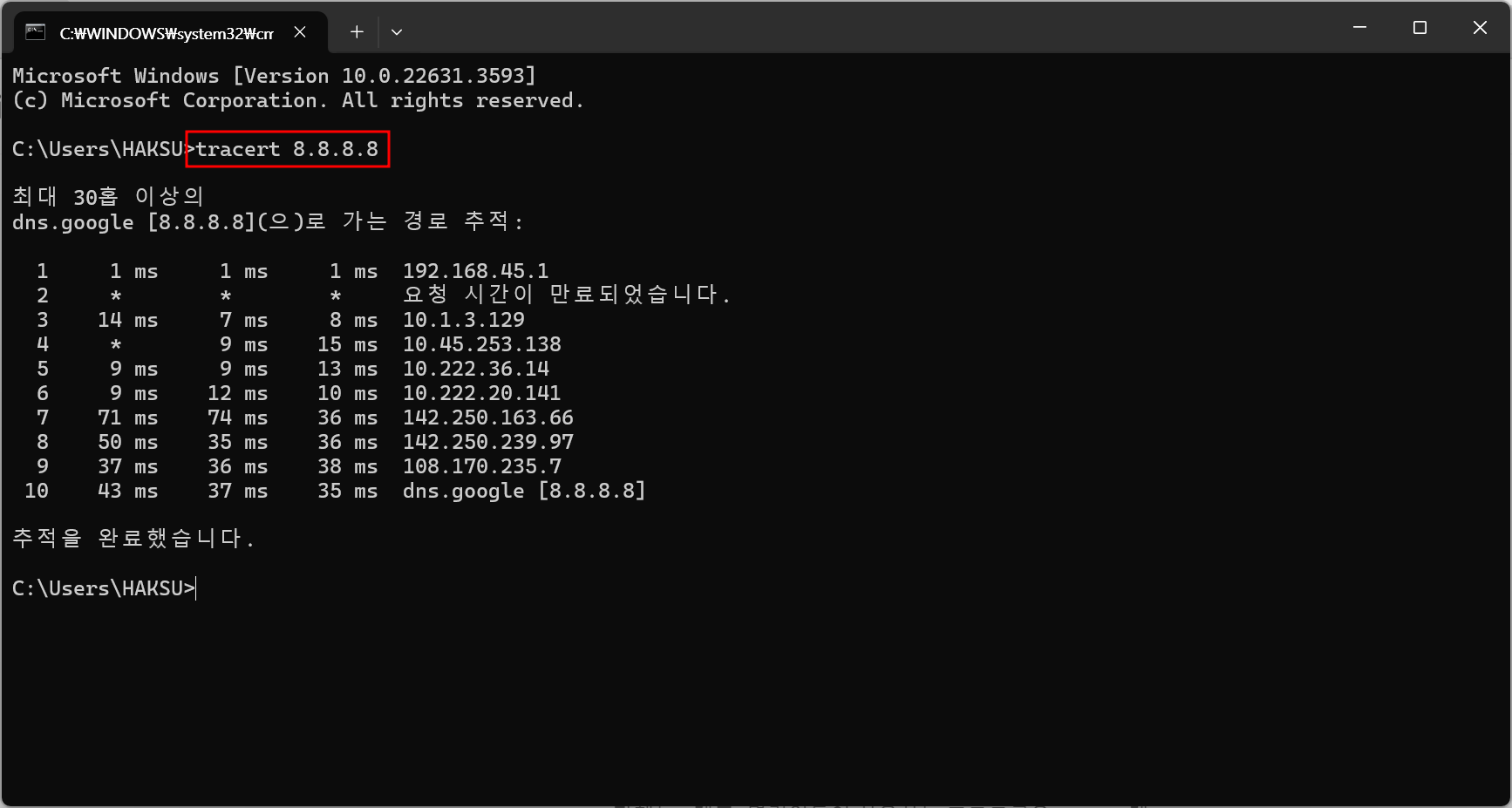 -> 8.8.8.8로 가는 경로 추적(경로 중 있는 라우터들의 주소 출력, 최대 30개의 라우터를 거쳐 갈 수 있음)