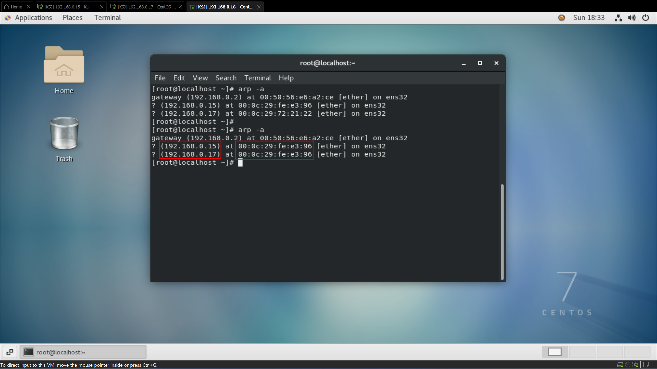 CentOS 7.6(192.168.0.18)의 MAC 주소가 Kali(192.168.0.15)의 MAC 주소인 00:0c:29:fe:e3:96으로 바뀜