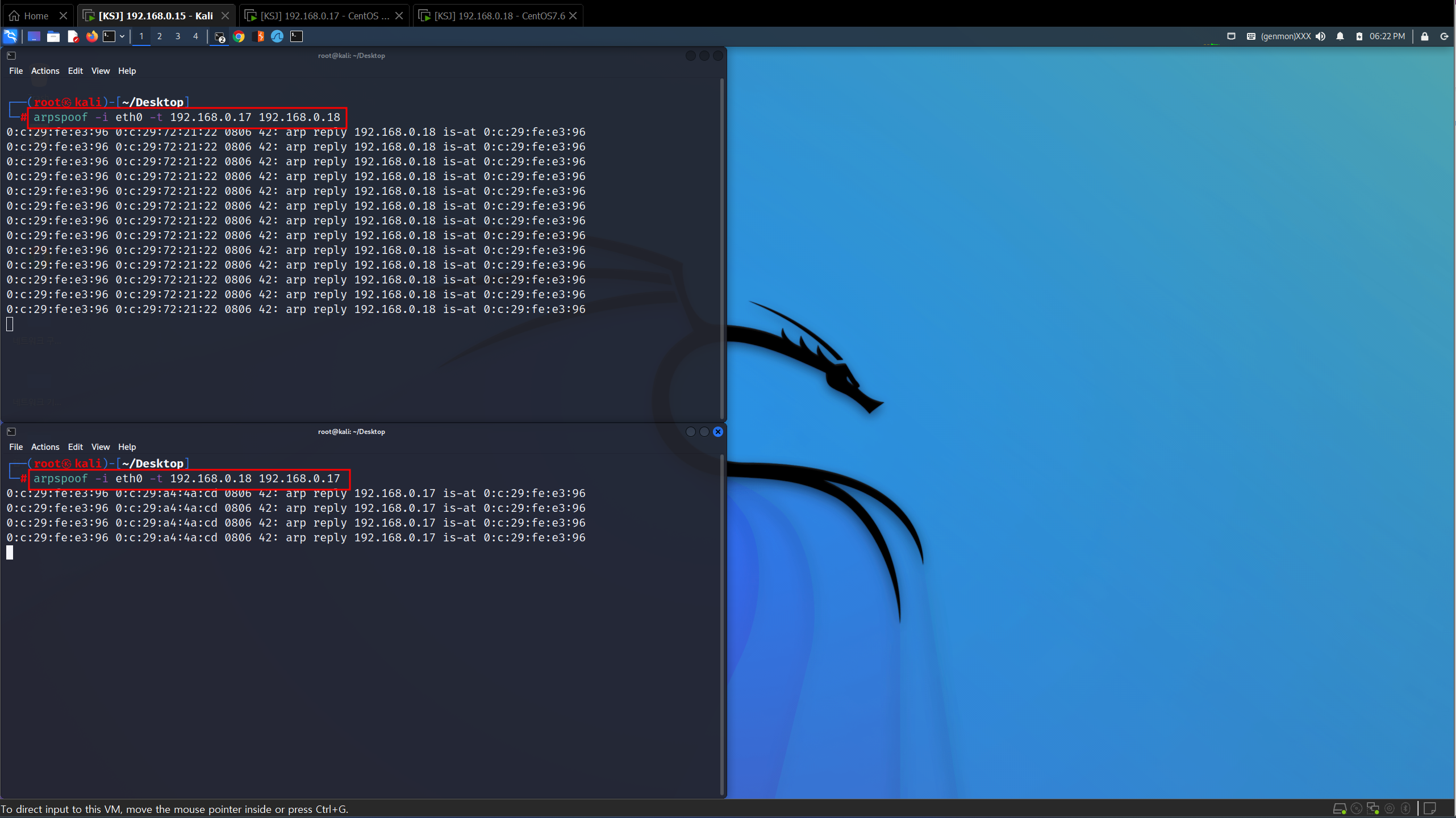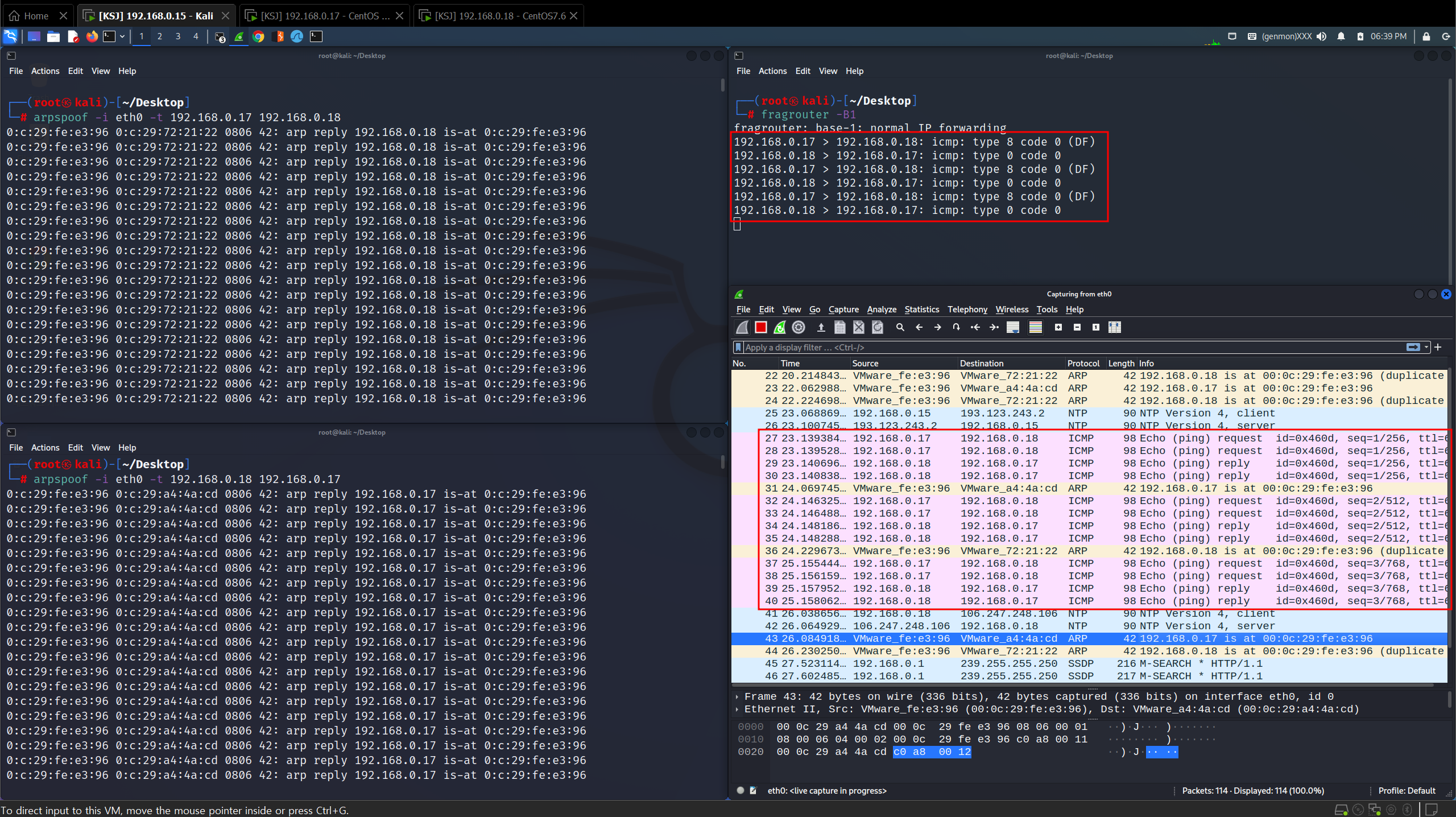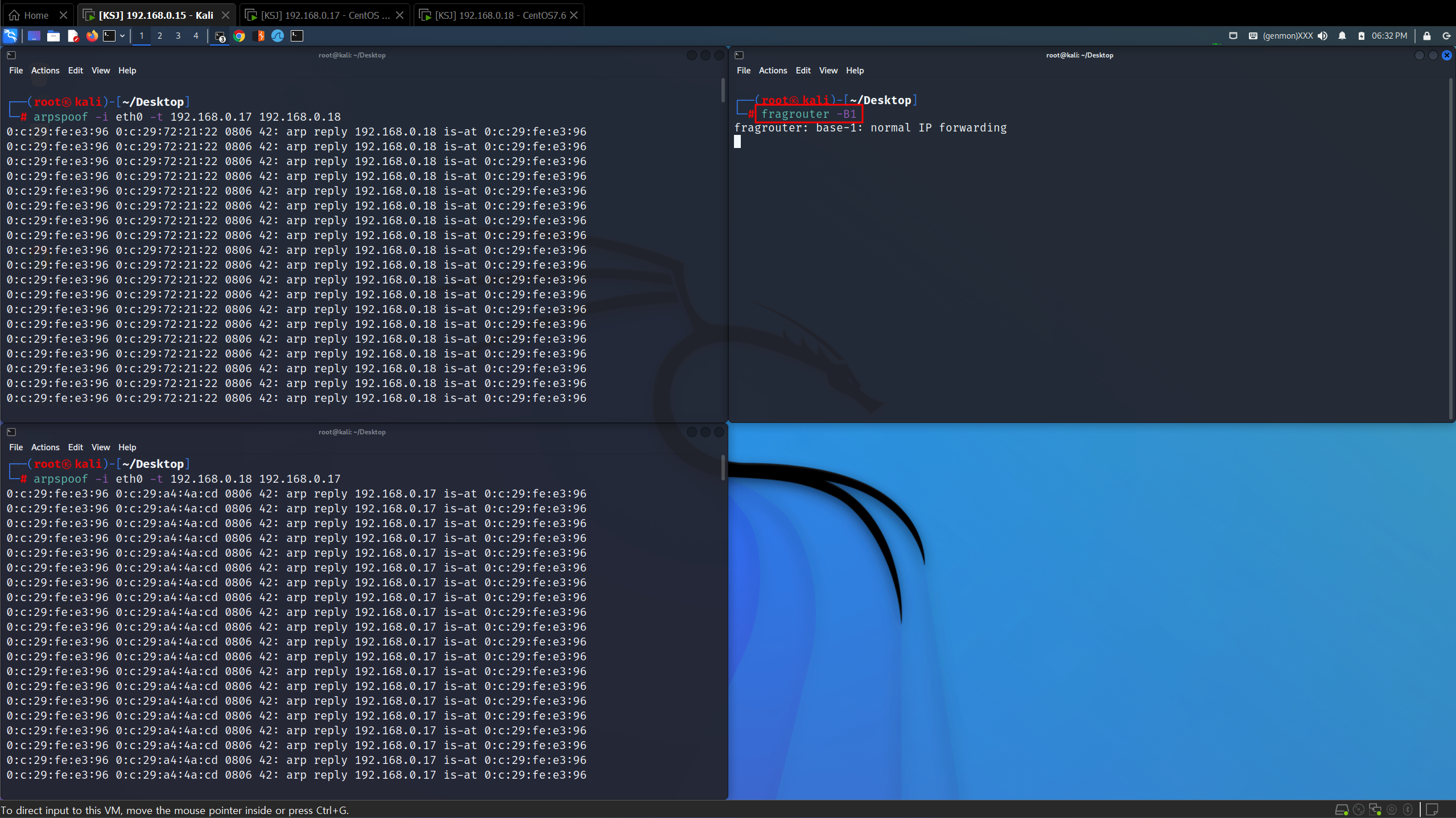 -> 192.168.0.17(CentOS 6.9)이 192.168.0.18(CentOS 7.6)로 패킷을 보내면 공격자(Kali)로 보내도록 ARP 테이블을 공격
