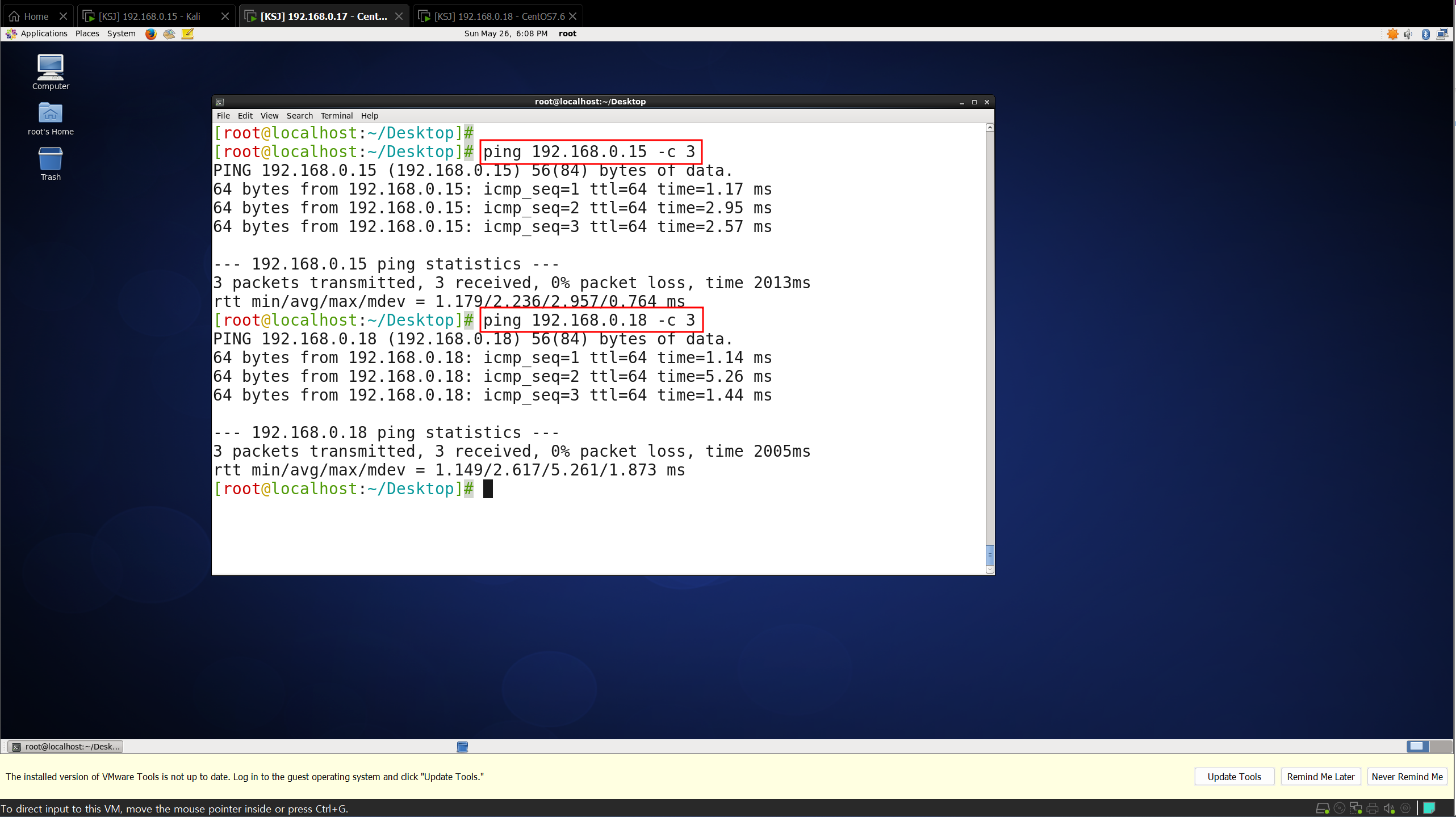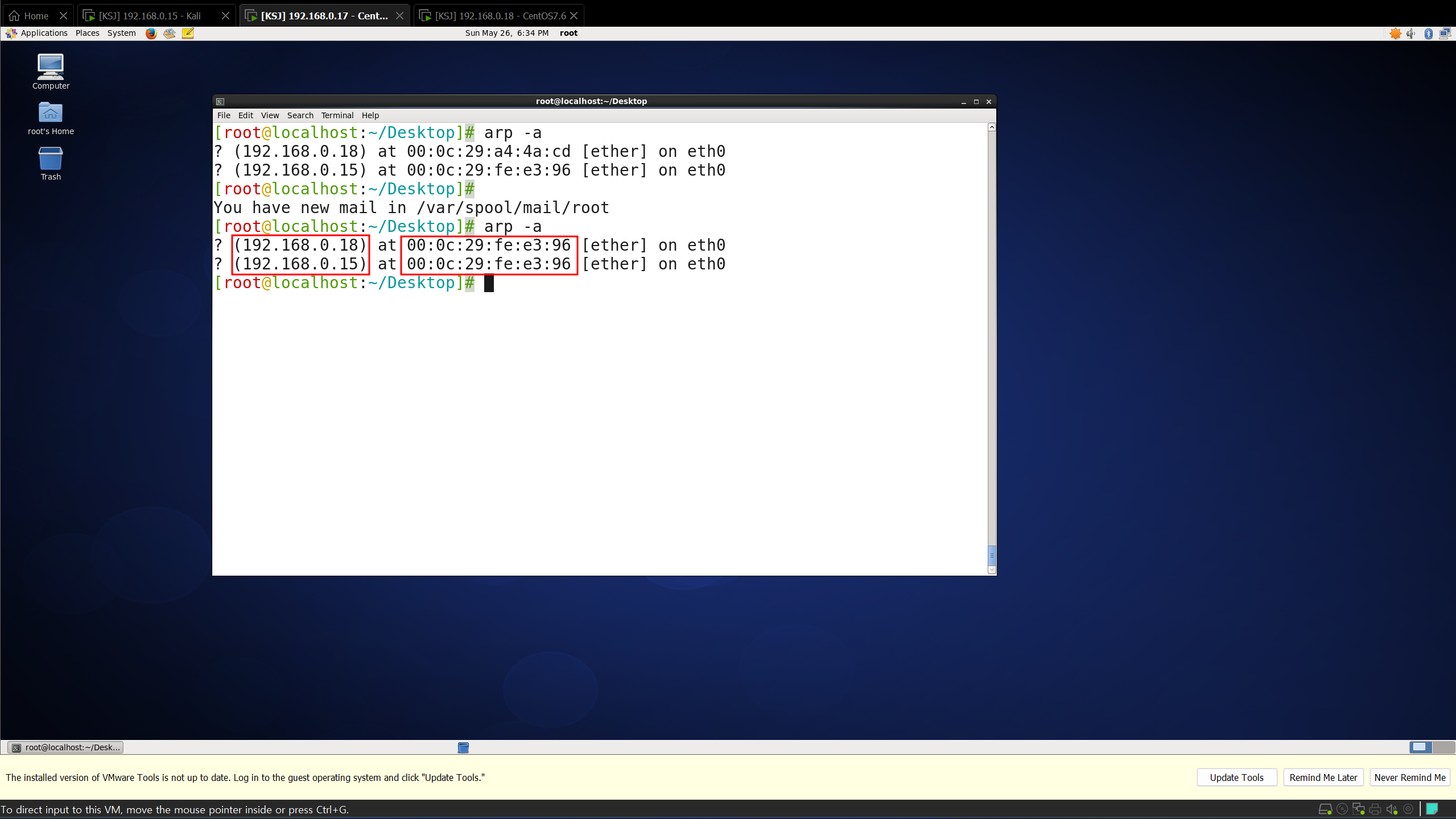 CentOS 6.7에서 Kail, CentOS 7.6으로 핑을 보내 정상적인 ARP 테이블 구성(Kail는 ARP 테이블 등록이 필요 없지만, 많으면 있어보이니까 ㅎㅎ)