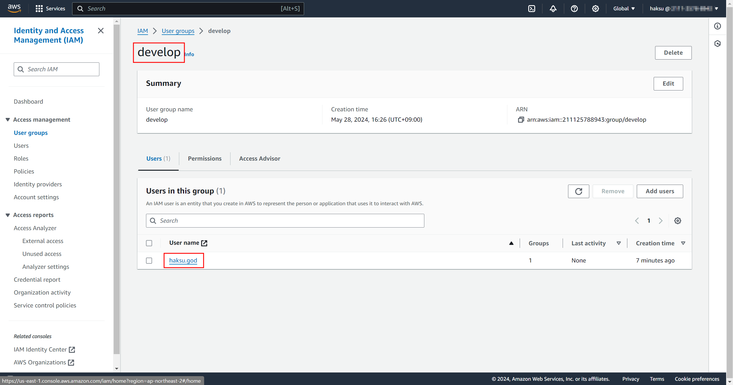 4. develop 그룹에 haksu.got 계정 추가
