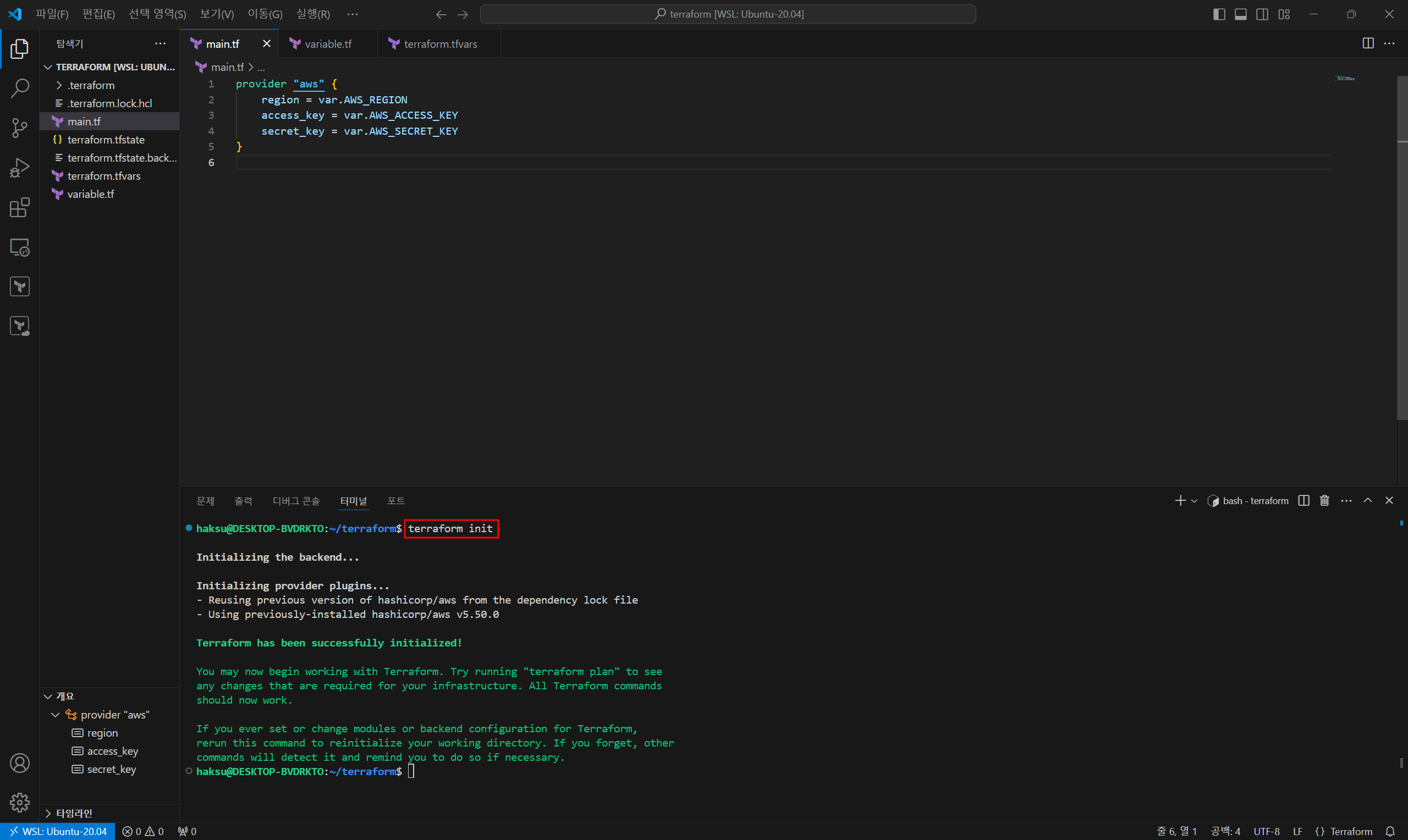 프로바이더 구성 후 terraform init 명령으로 프로바이더에 대한 코드 초기화