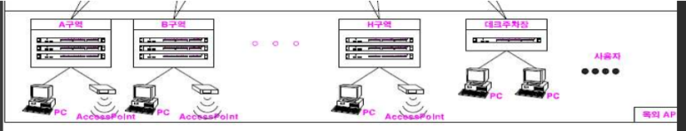 - 아래 A구역~H구역, 데크주차장이 있는 옥외AP(AccessPoint)에 있는 스위치가 분배 계층, 액세스 계층에 해당하는 것으로 보임