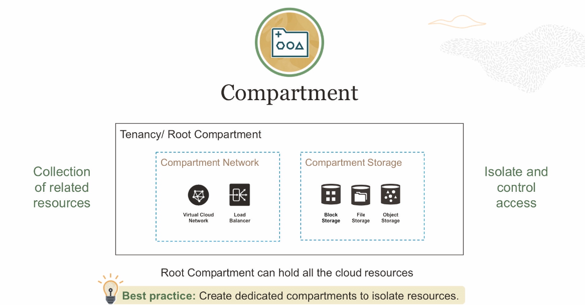 Compartment를 사용하면 클라우드 리소스에 대한 액세스를 구성하고 제어할 수 있다. Compartment는 관리자가 권한이 부여된 특정 그룹만 액세스할 수 있는 관련 리소스(인스턴스, 가상 클라우드 네트워크, 블록 볼륨 등)의 모음이다. 자원들을 쉽게 관리할 수 있도록 하는 개념으로 디렉터리 구조로 생각할 수 있다.