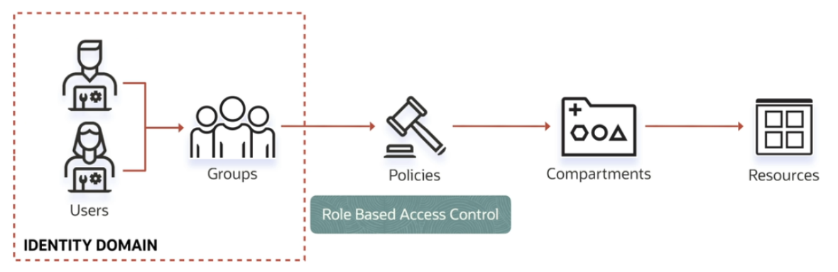 Identity Domains은 사용자 및 역할 관리, 사용자 페더레이션 및 프로비저닝, Oracle Single Sign-On(SSO) 구성을 사용한 보안 애플리케이션 통합 및 OAuth 관리를 위한 컨테이너이다. 이는 Oracle Cloud Infrastructure 사용자 인구와 관련 구성 및 보안 설정(ex. MFA)을 나타낸다.