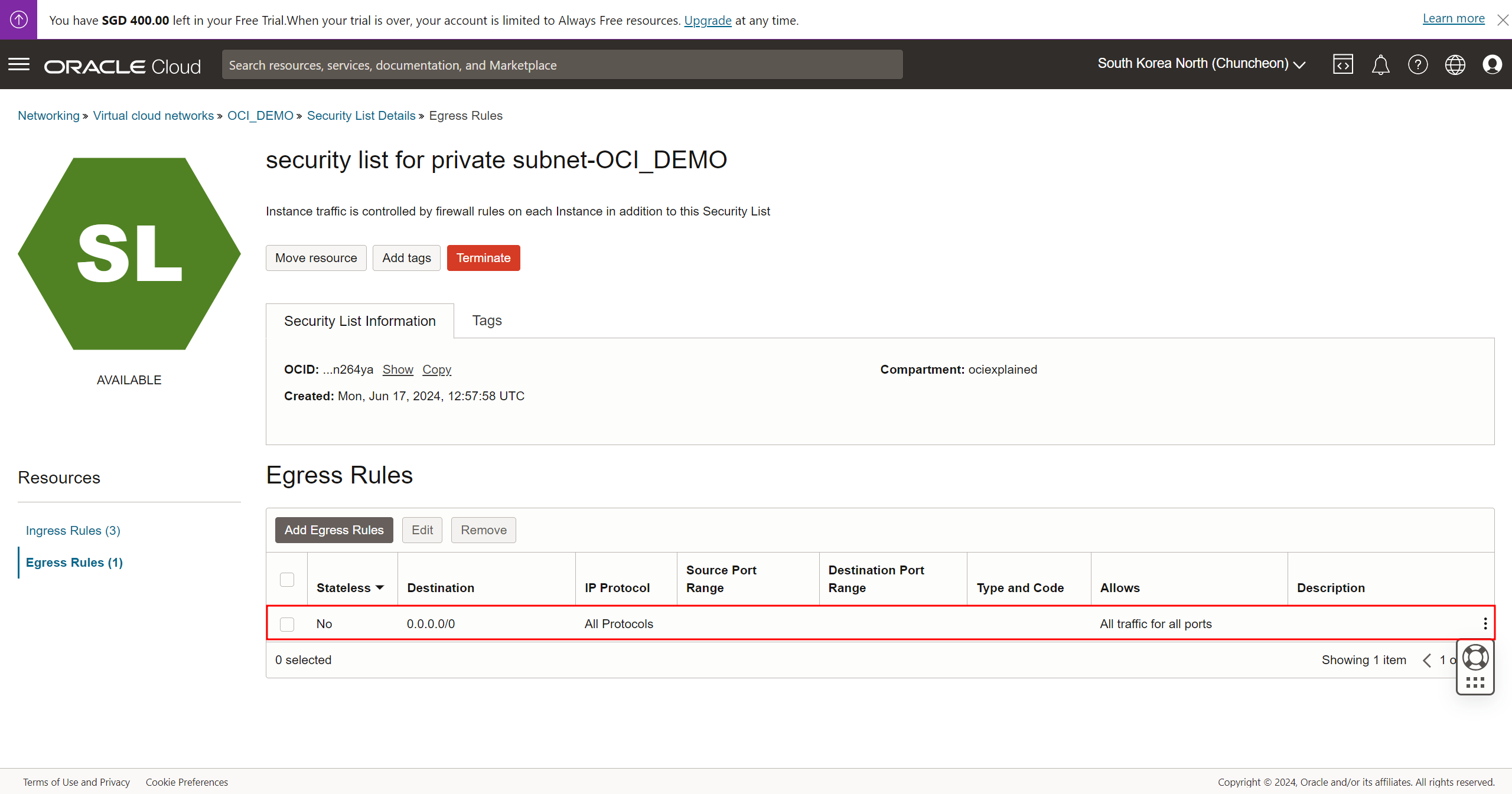 security_list_for_private_subnet-OCI_DEMO 이름으로 시큐리티 리스트 생성됨