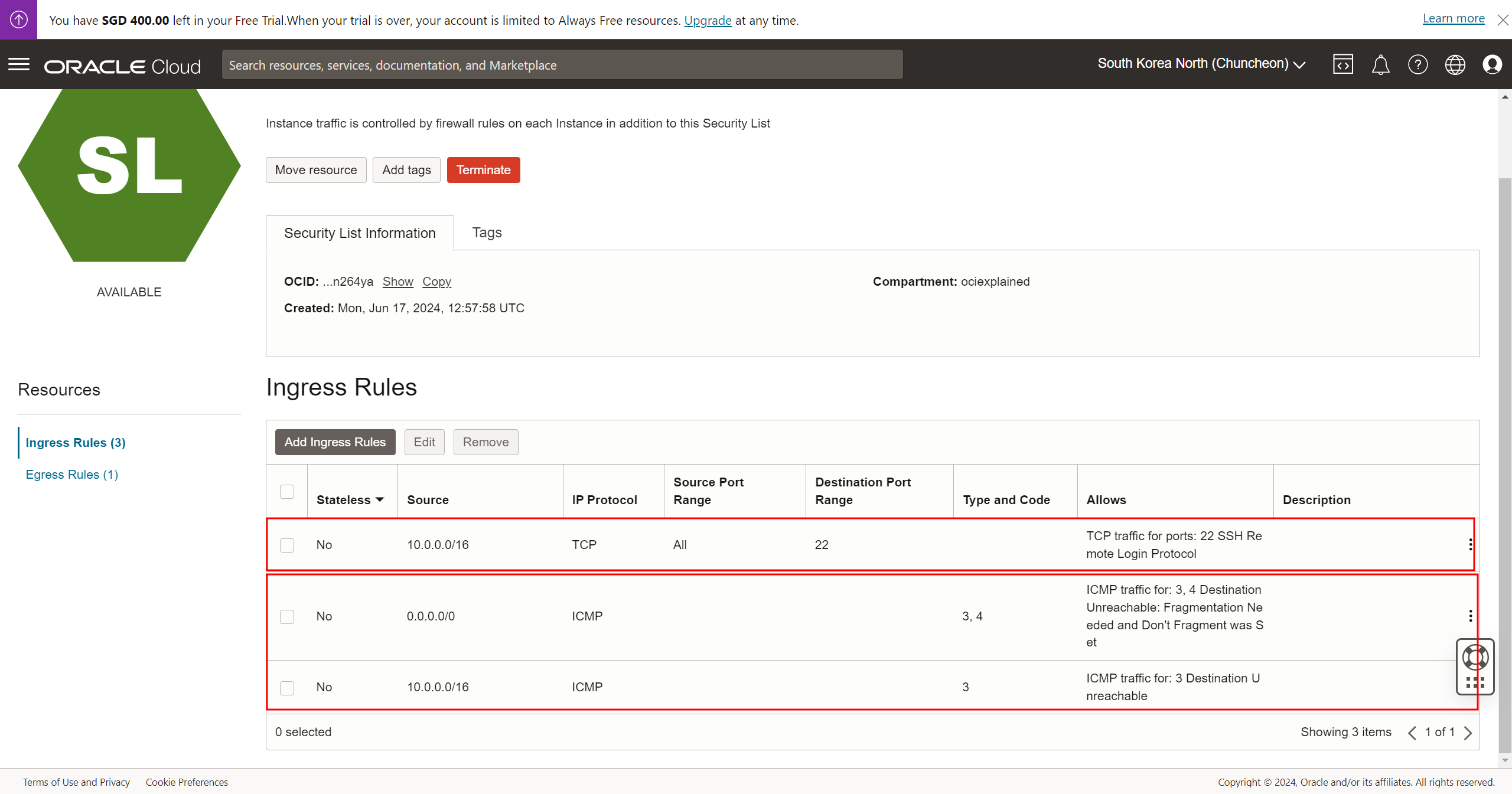 - VCN 내에서 Ingress(수신) 및 Egress(송신) 트래픽에 대한 보안 규칙을 정의하는 자원이다. 오라클 클라우드에서는 인바운드와 아웃바운드라는 용어 대신에 Ingress와 Egress라는 용어를 사용한다.