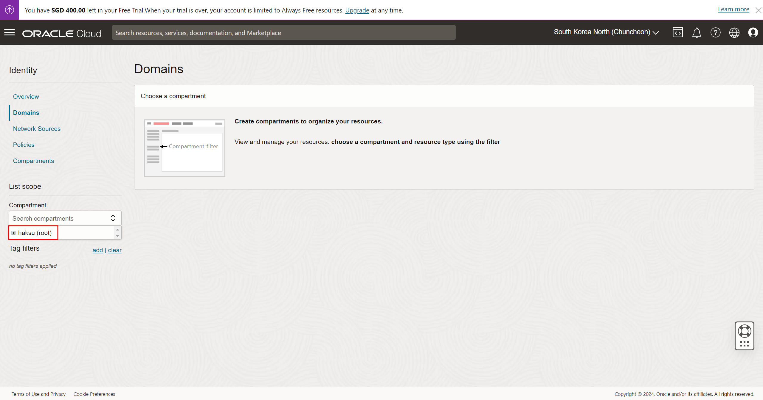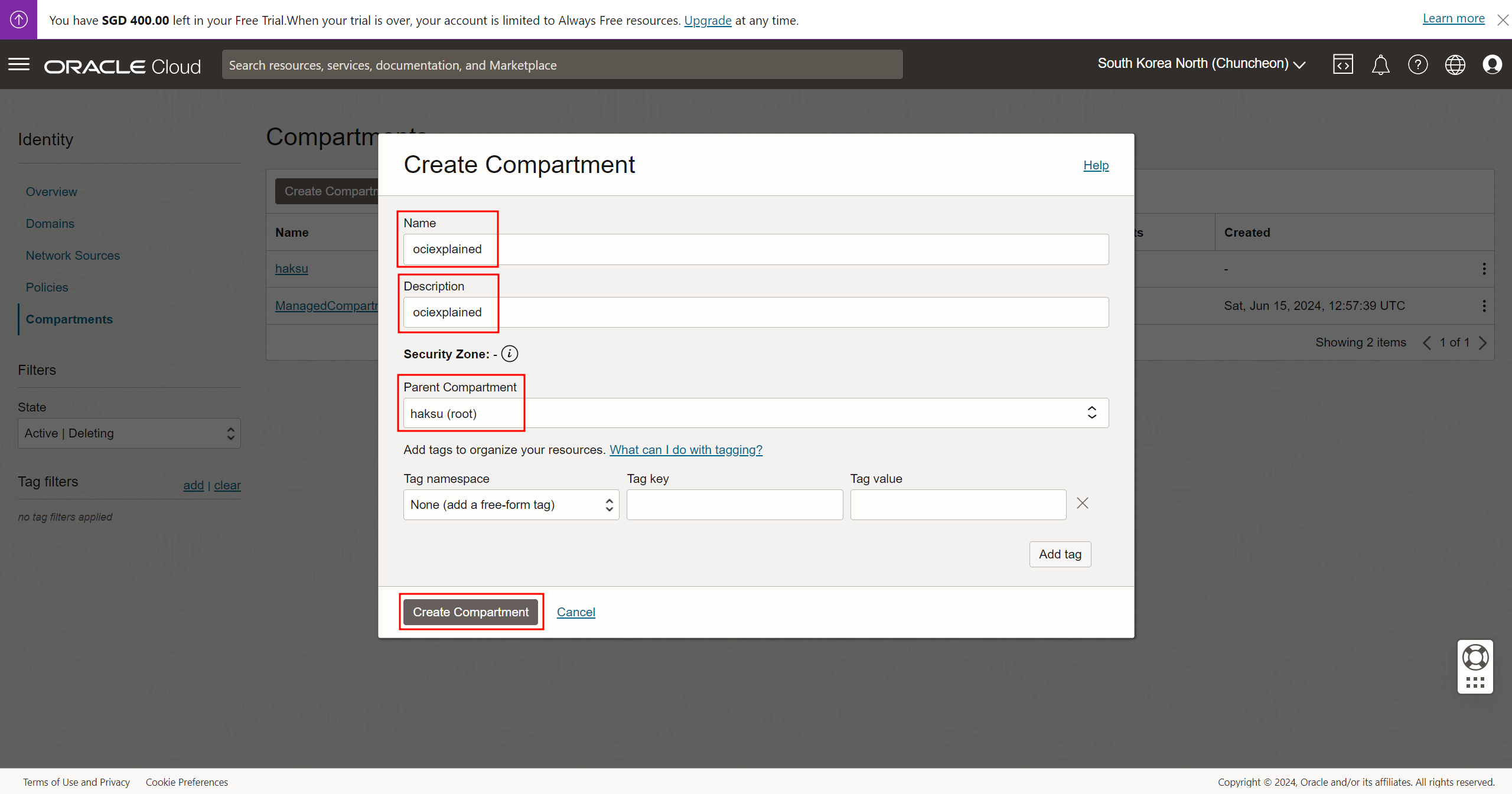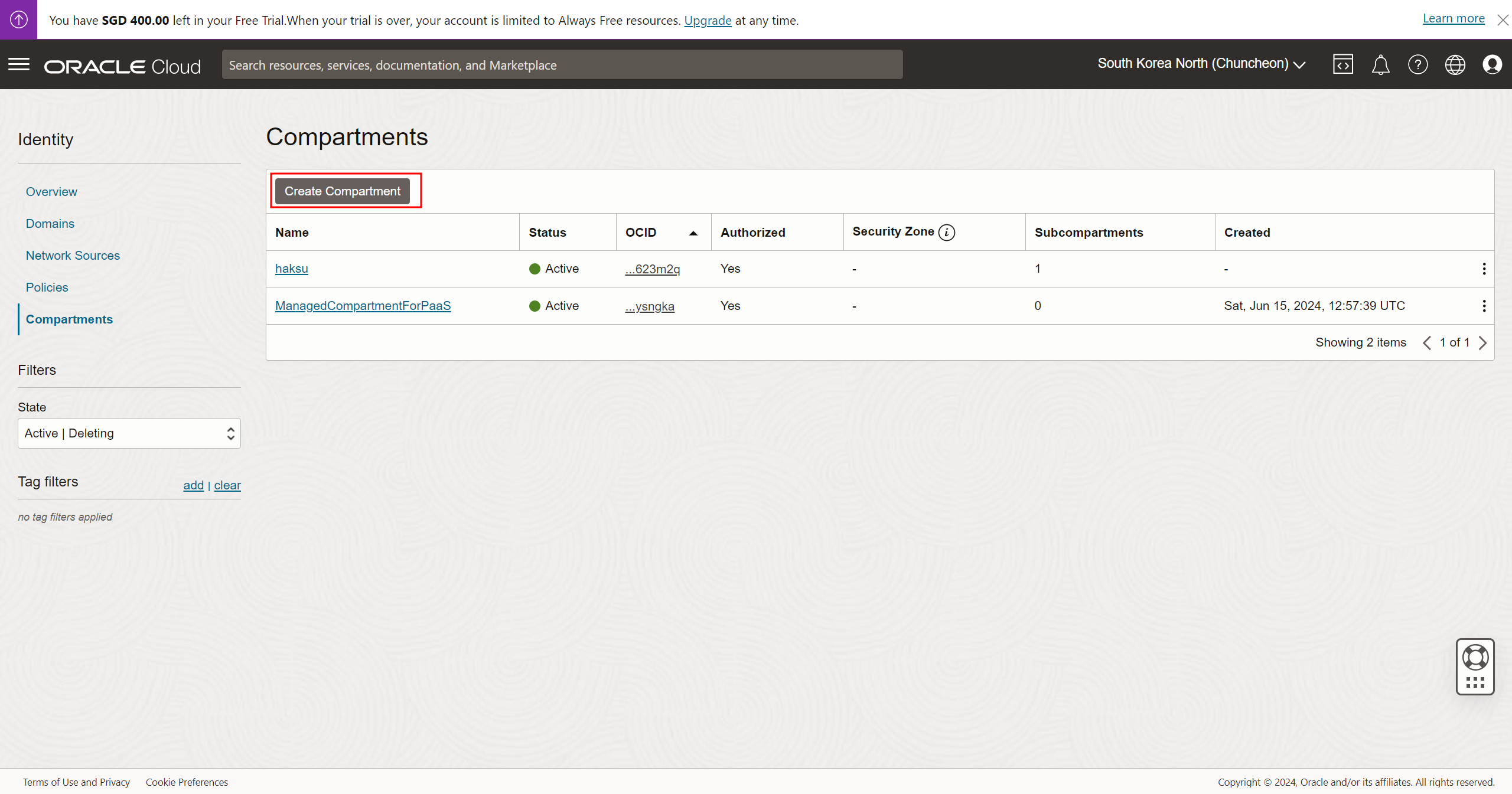 클라우드 자원의 격리 단위라고 할 수 있는 컴파트먼트를 생성한다.