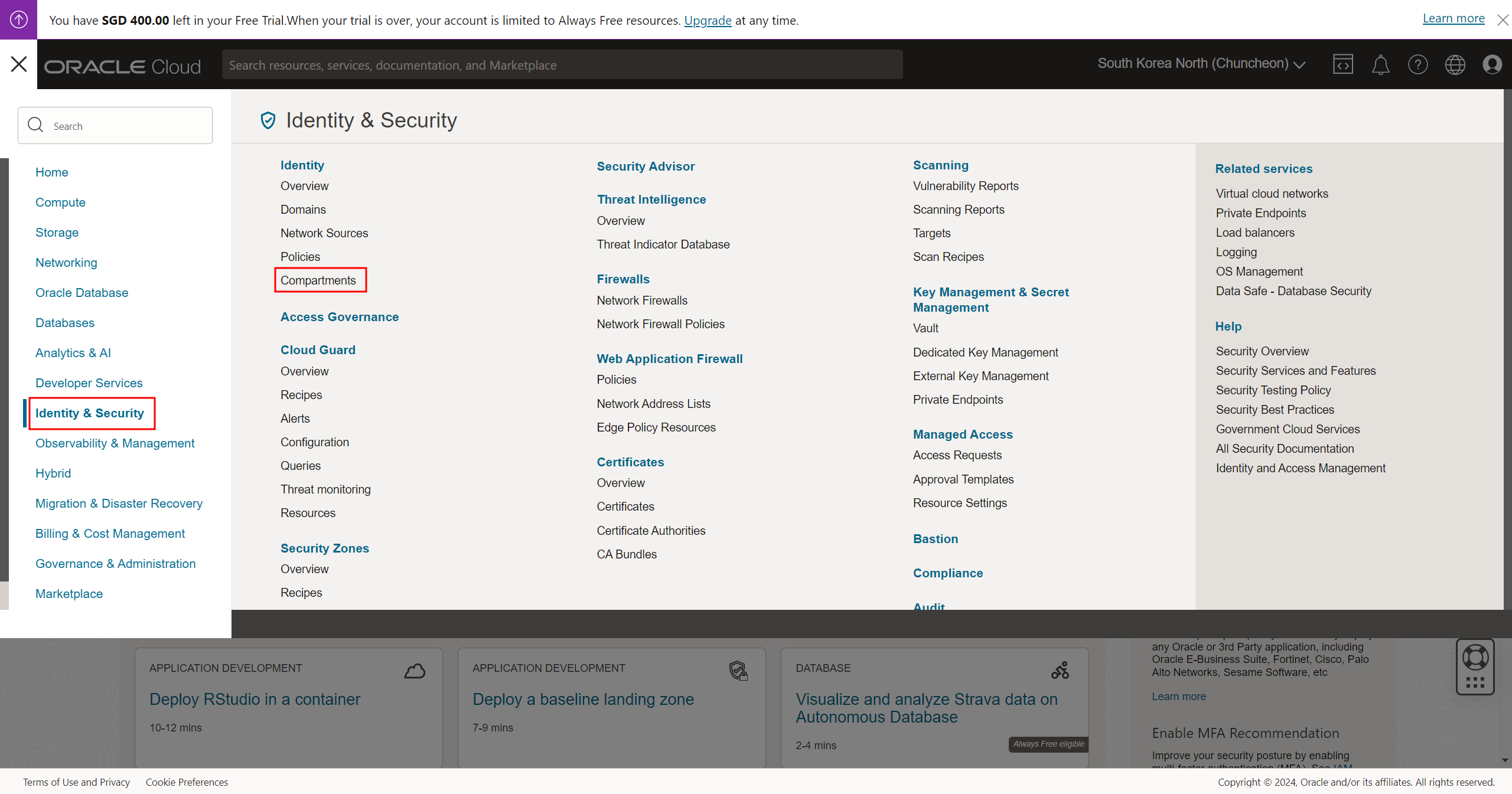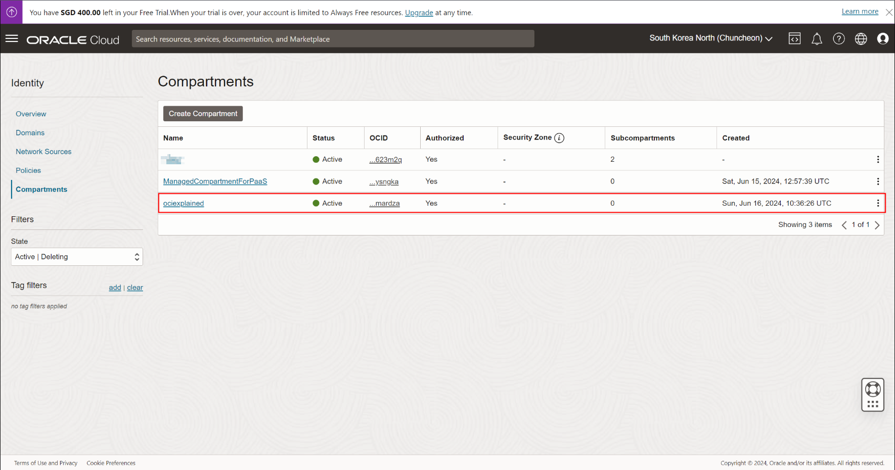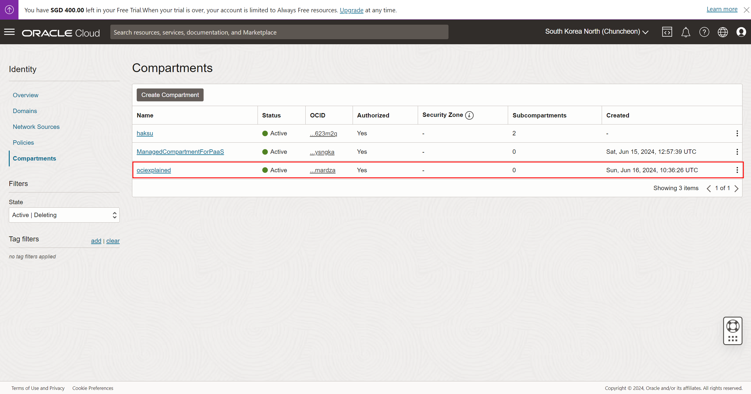 클라우드 자원의 격리 단위라고 할 수 있는 컴파트먼트를 생성한다.