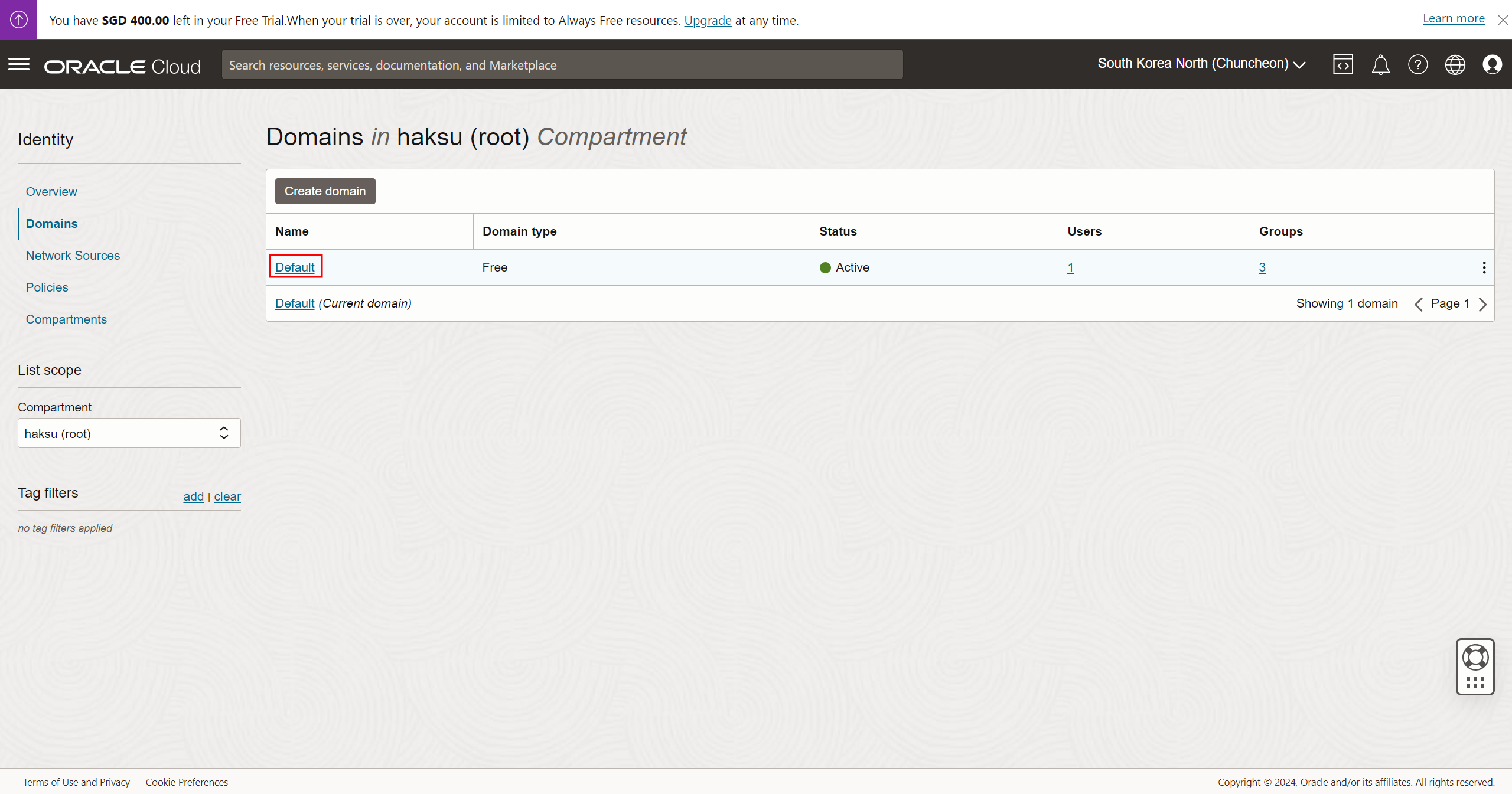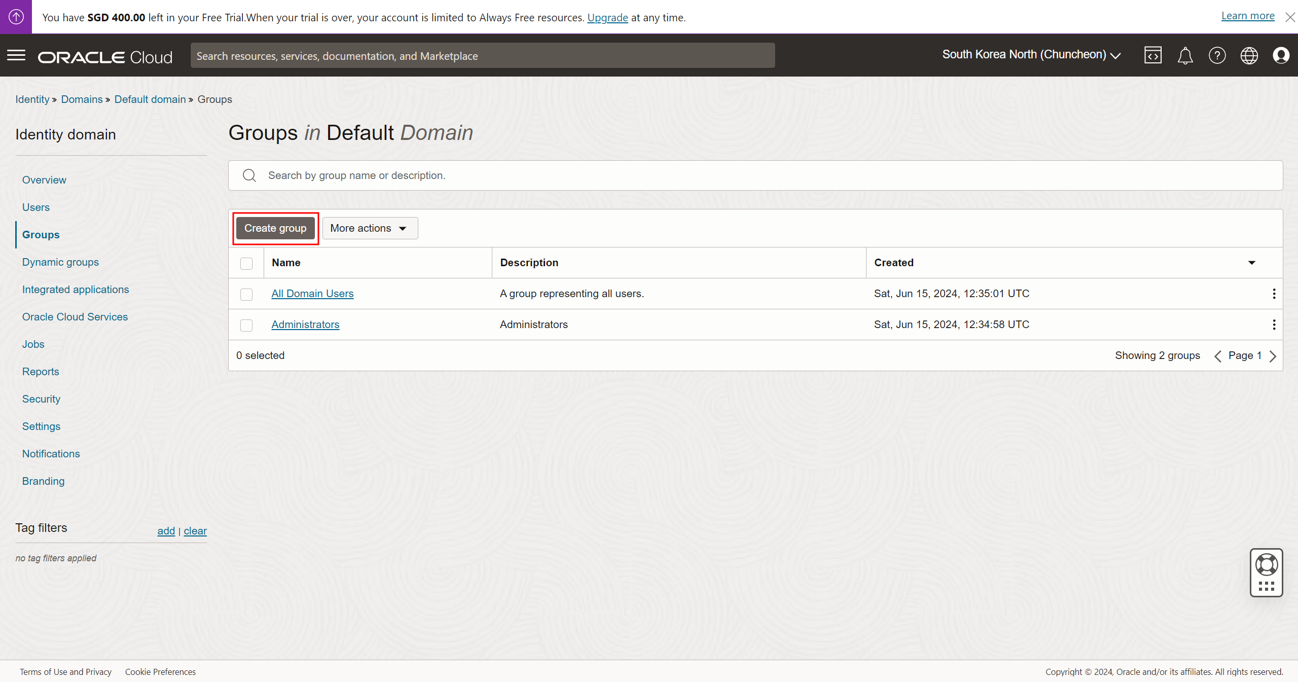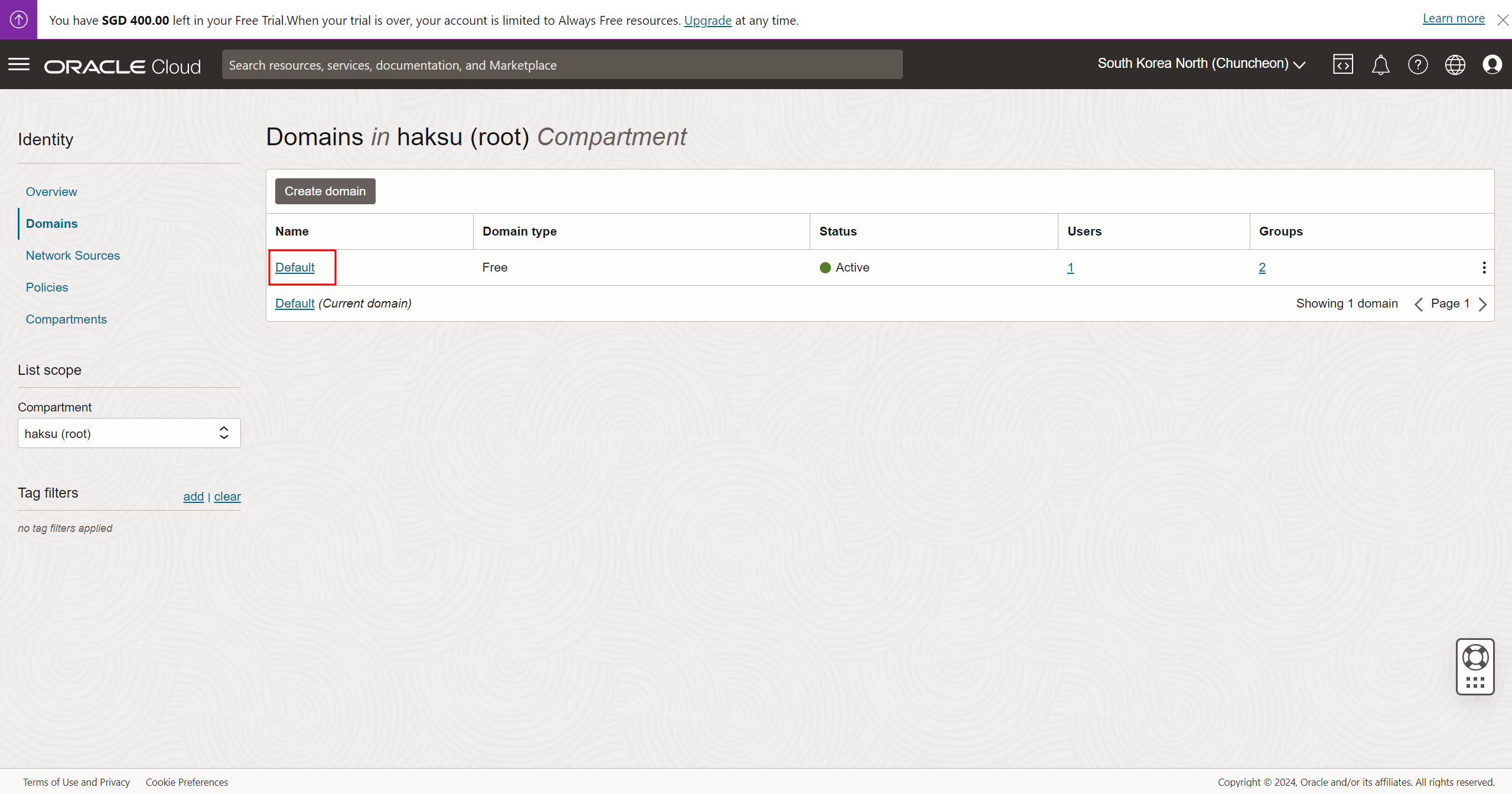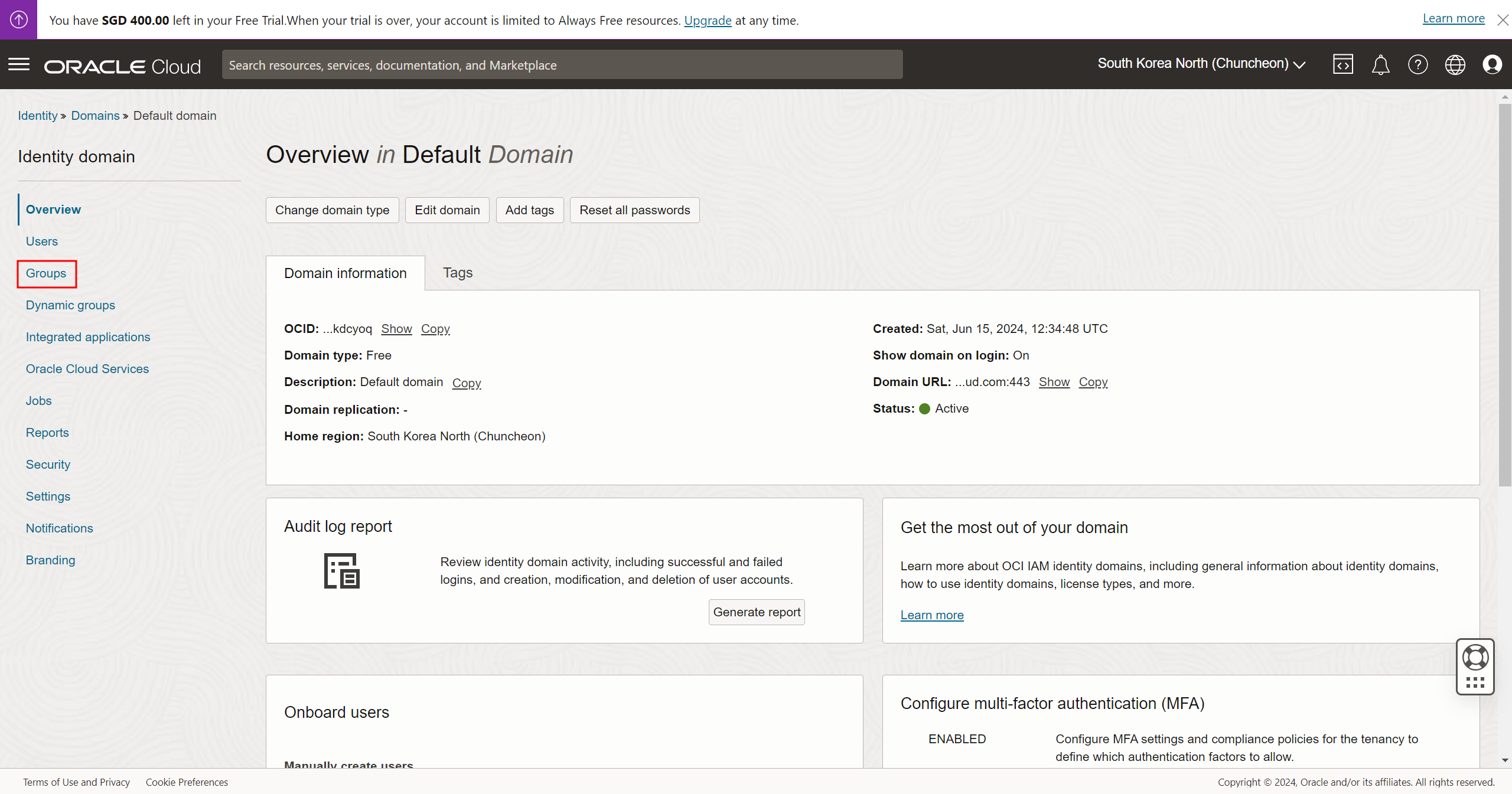 유저와 그룹은 도메인이라고하는 더 포괄적인 클라우드 자원으로 묶어서 관리된다. 도메인은 효과적인 자원의 관리를 위해 유저, 그룹, Oracle SSO(Single Sign-On) 구성, 다이나믹 그룹(Dynamic Group) 등과 같은 권한 관리 자원들을 담는 그릇으로 생각할 수 있다.