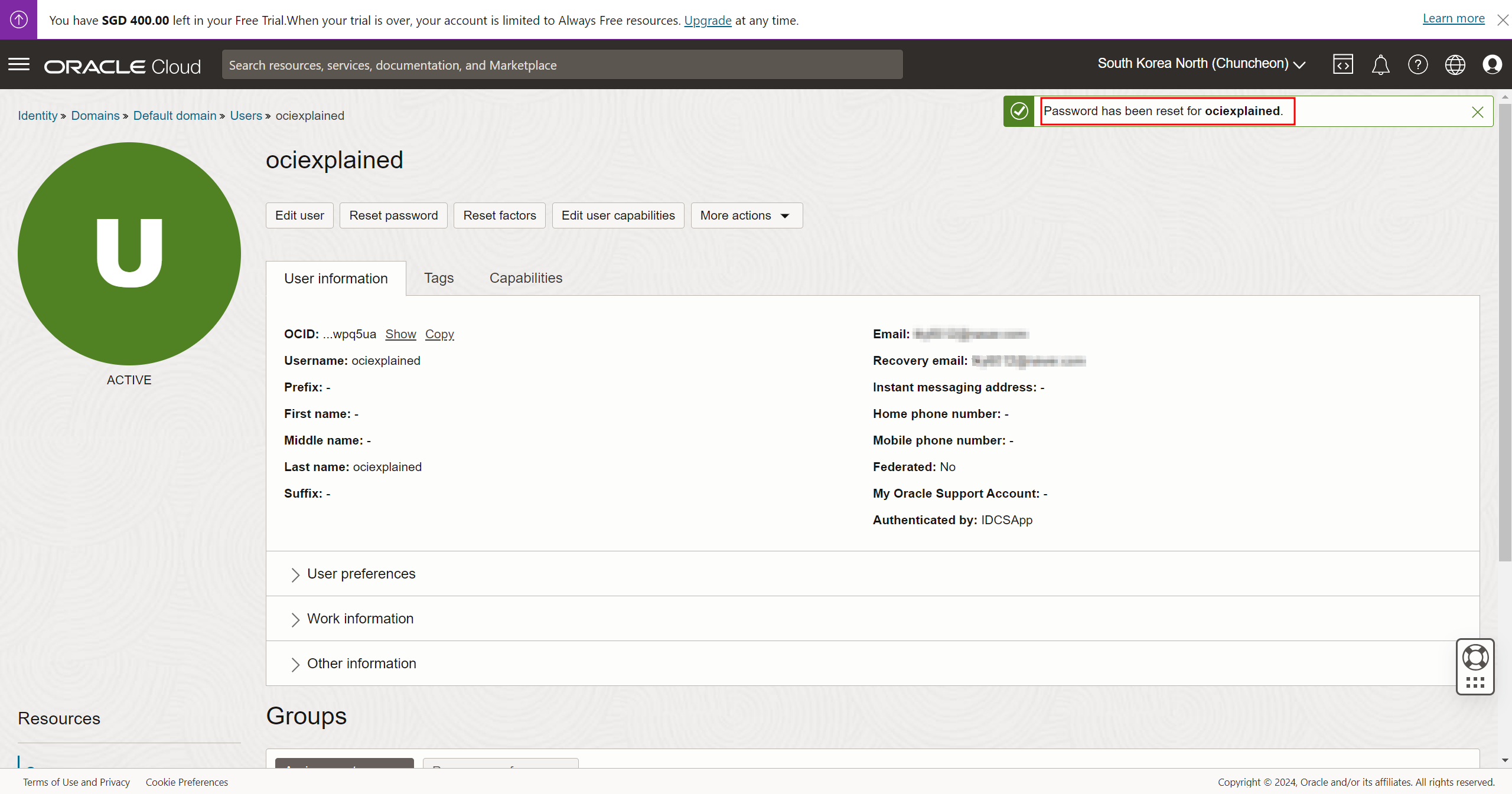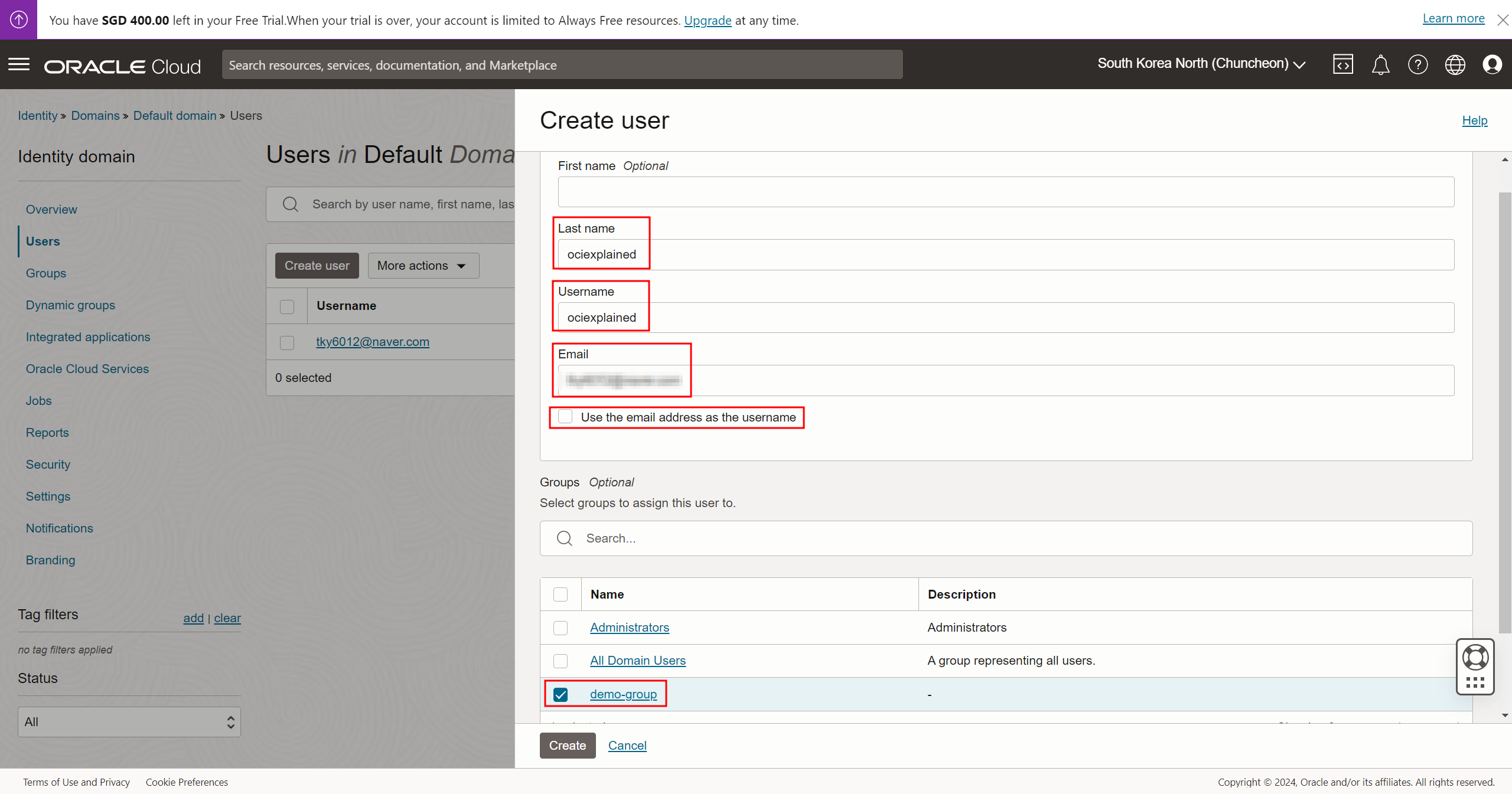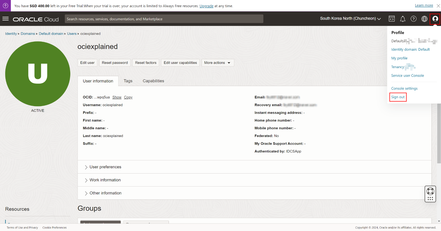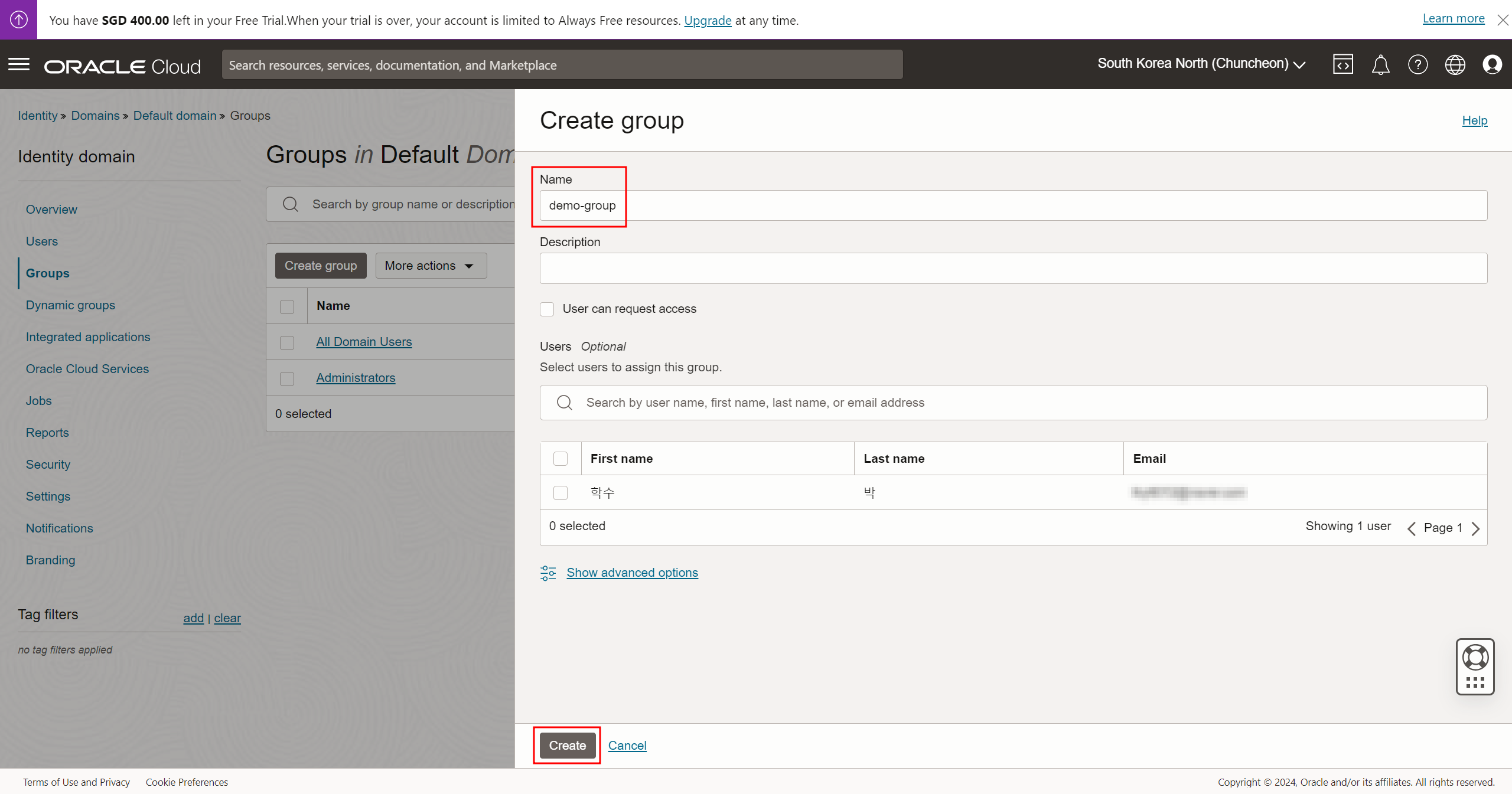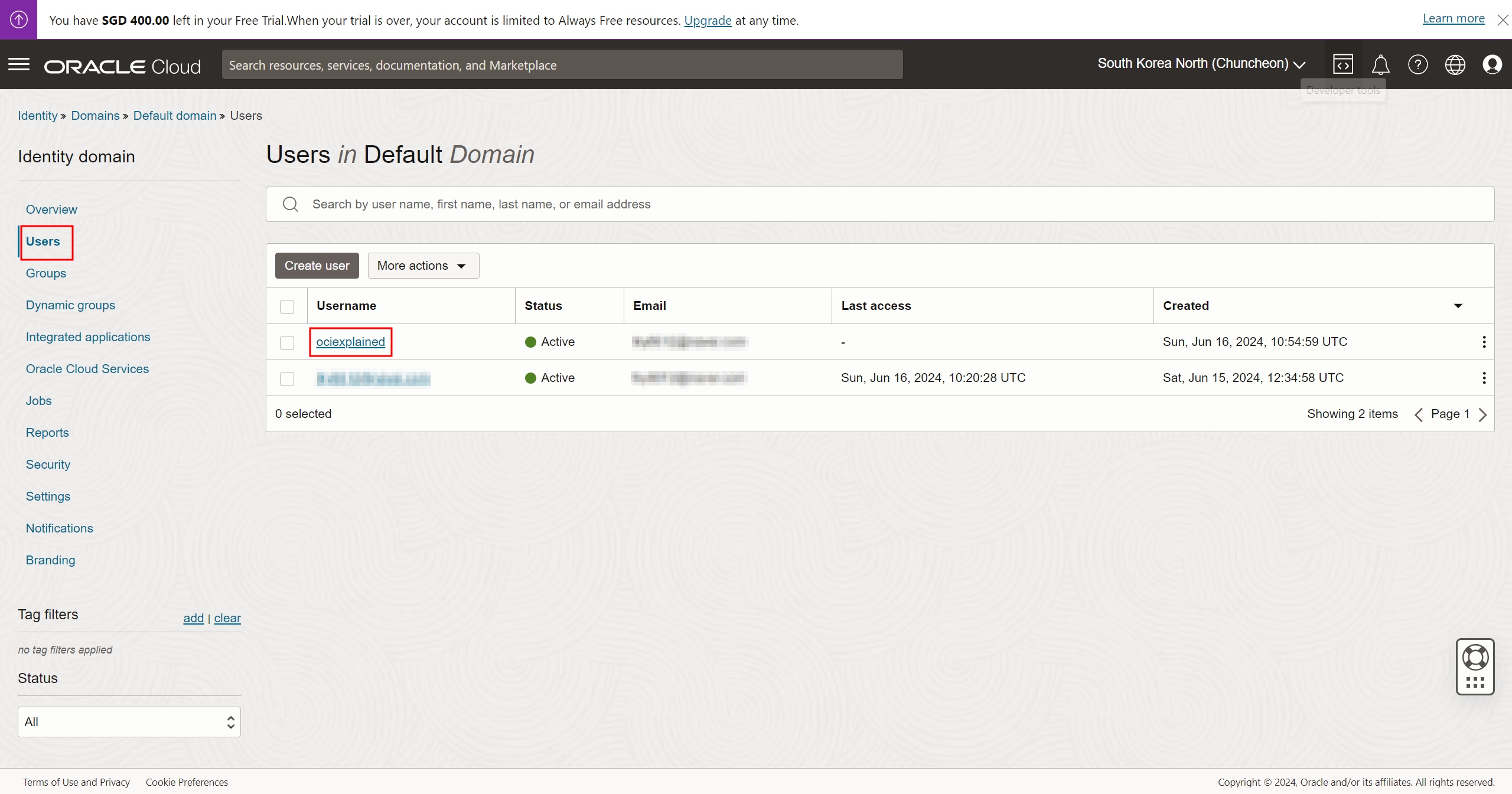 유저와 그룹은 도메인이라고하는 더 포괄적인 클라우드 자원으로 묶어서 관리된다. 도메인은 효과적인 자원의 관리를 위해 유저, 그룹, Oracle SSO(Single Sign-On) 구성, 다이나믹 그룹(Dynamic Group) 등과 같은 권한 관리 자원들을 담는 그릇으로 생각할 수 있다.