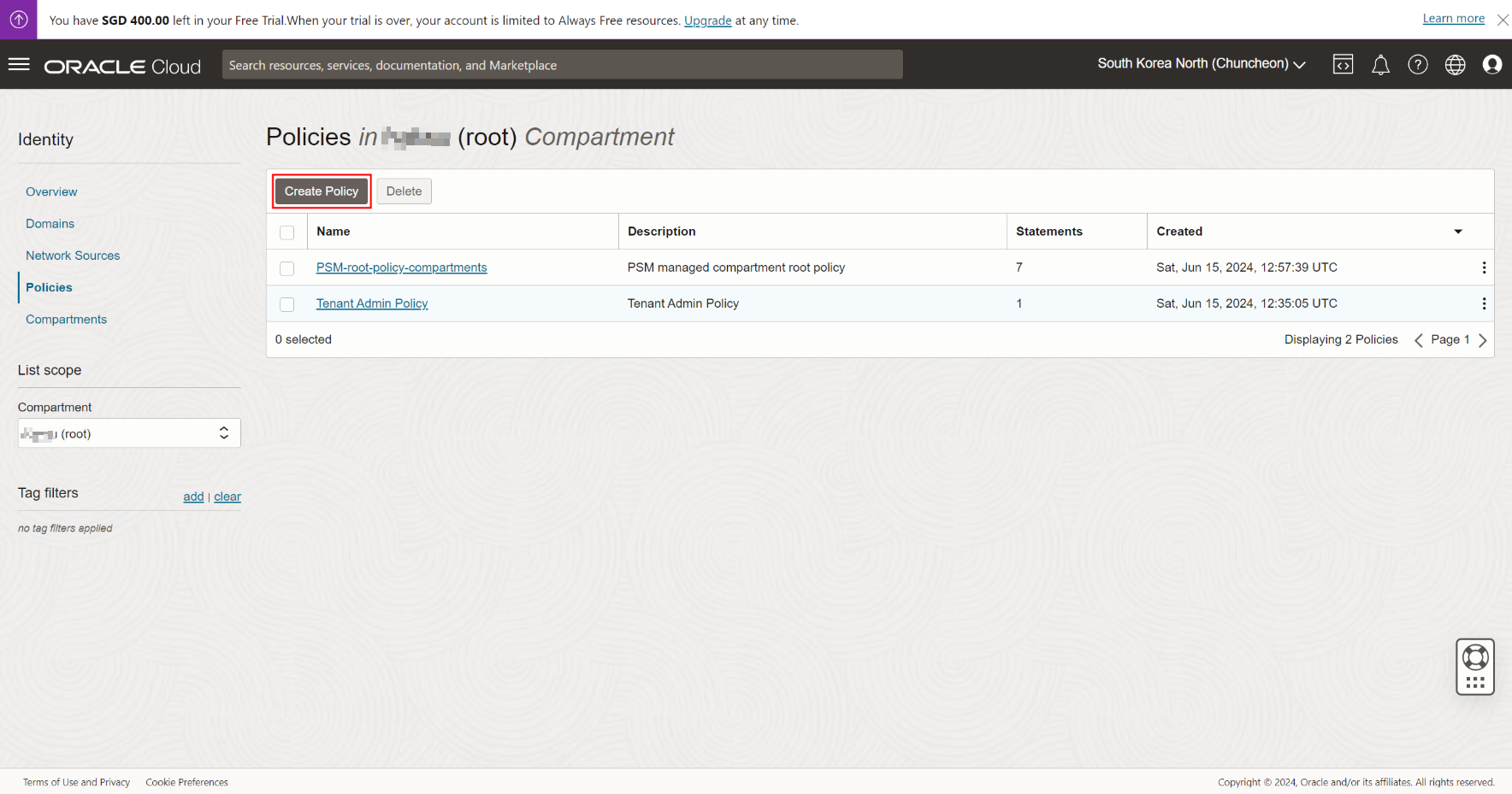 정책은 테넌시 레벨로 정의되는 자원이므로 화면 왼쪽에서 root 컴파트먼트를 선택하고 진행한다!