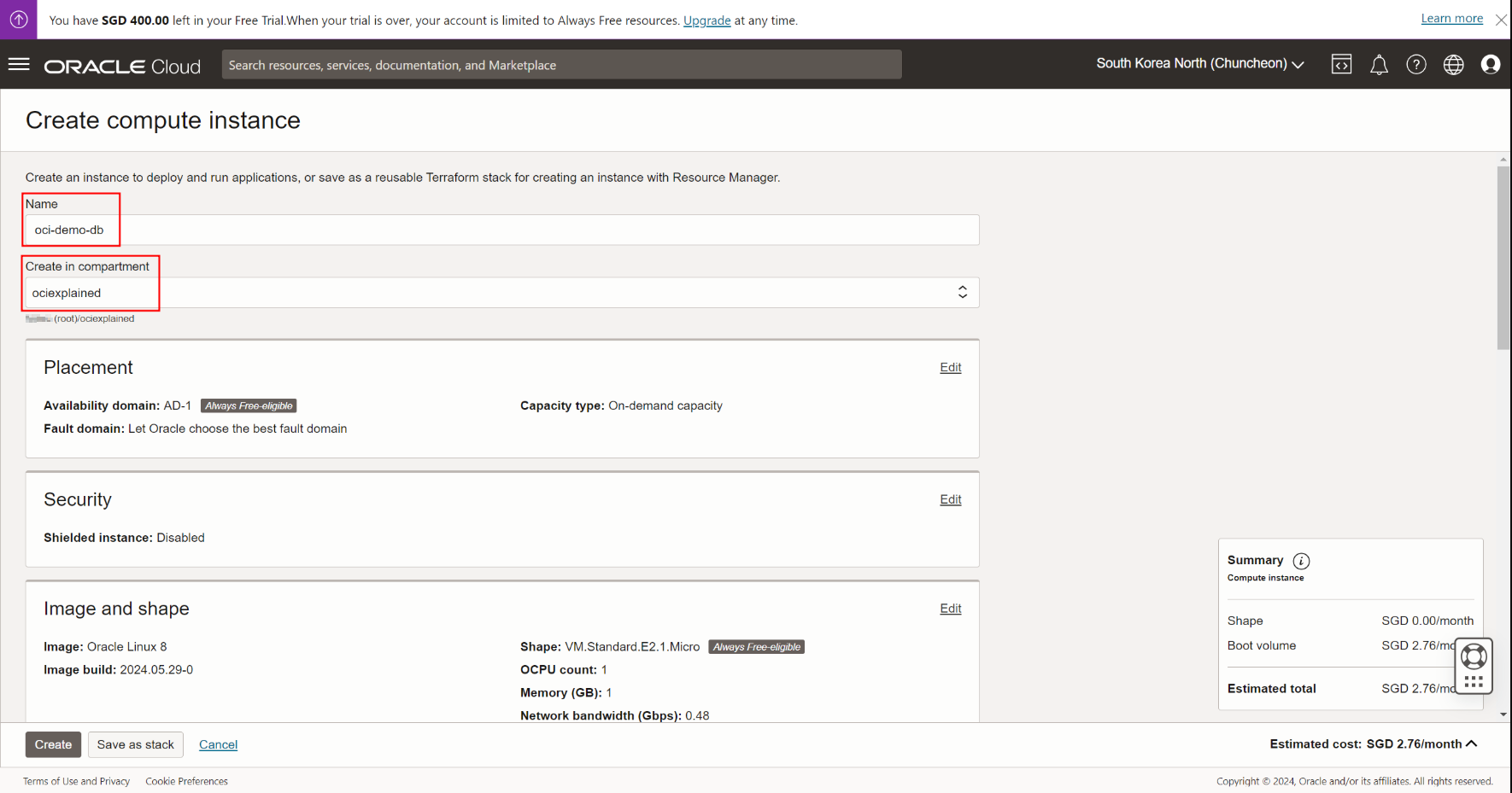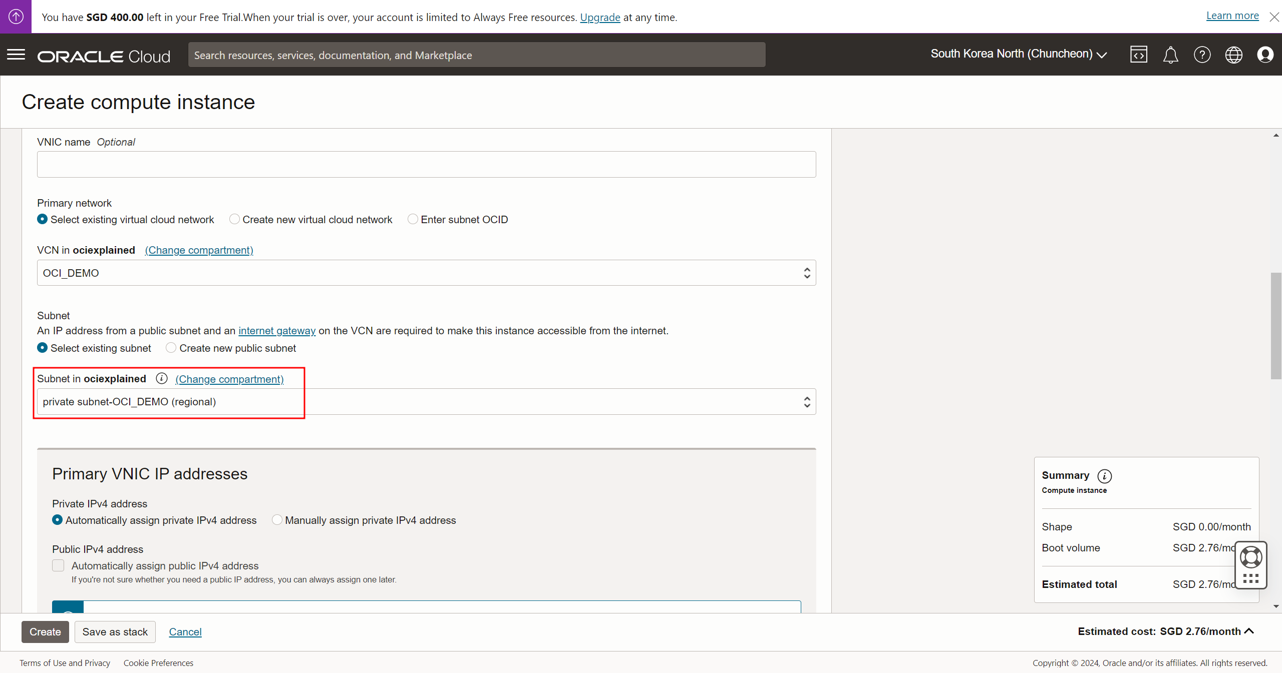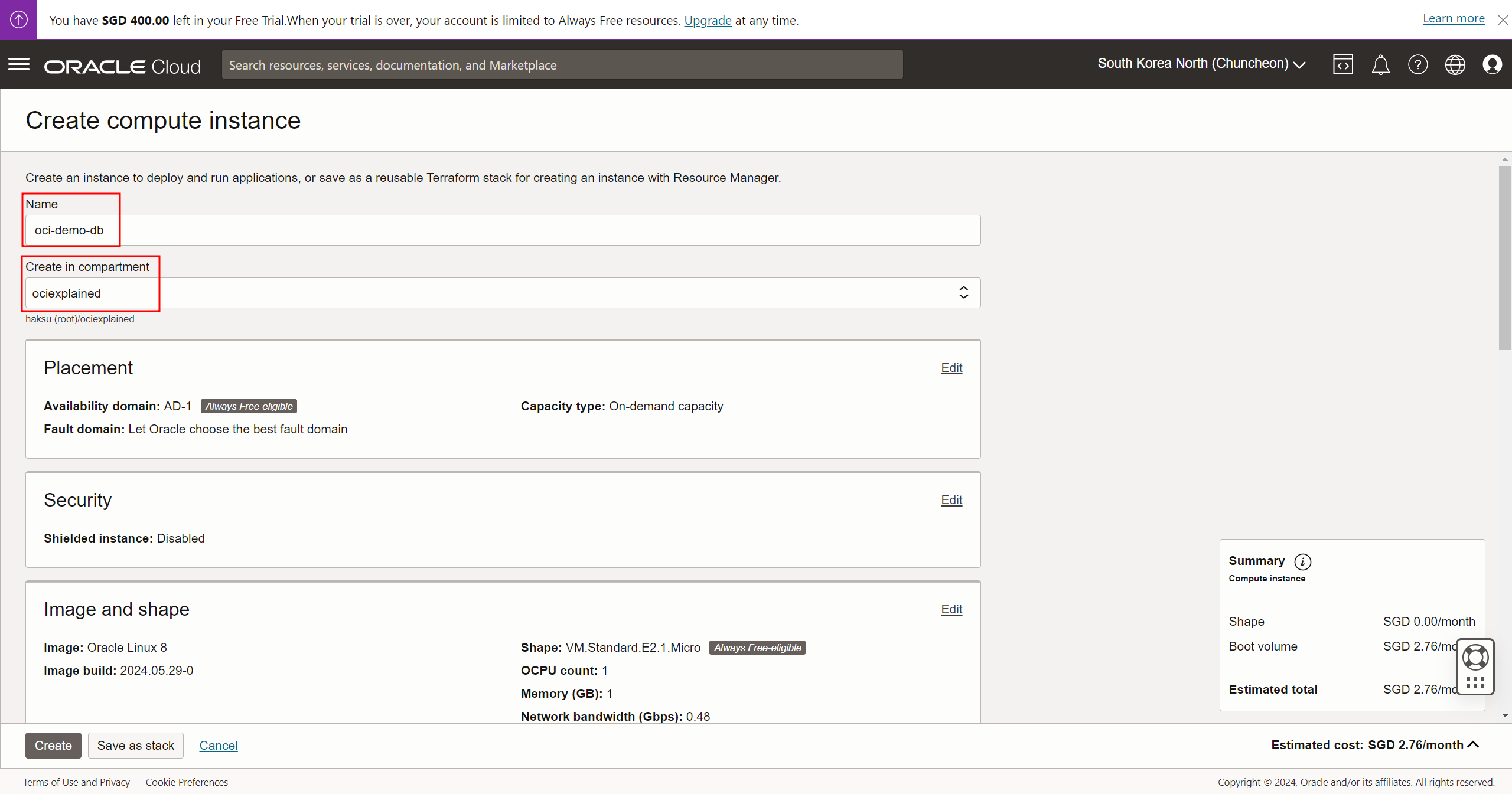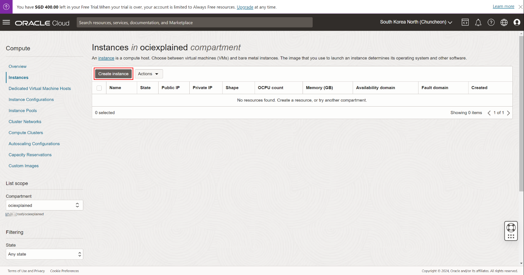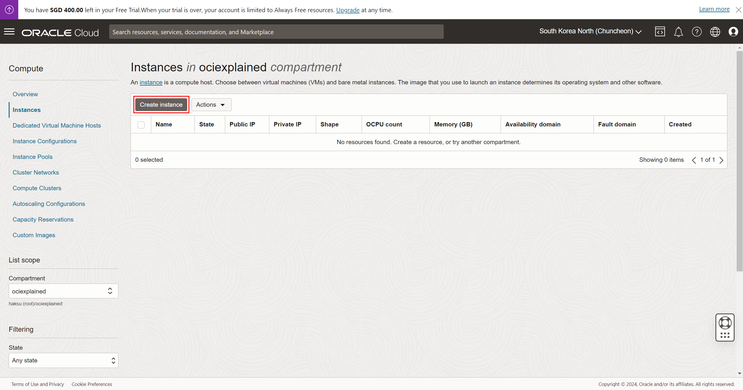 Create in Compartment : ociexplained (리소스를 배포하려는 컴파트먼트 선택)