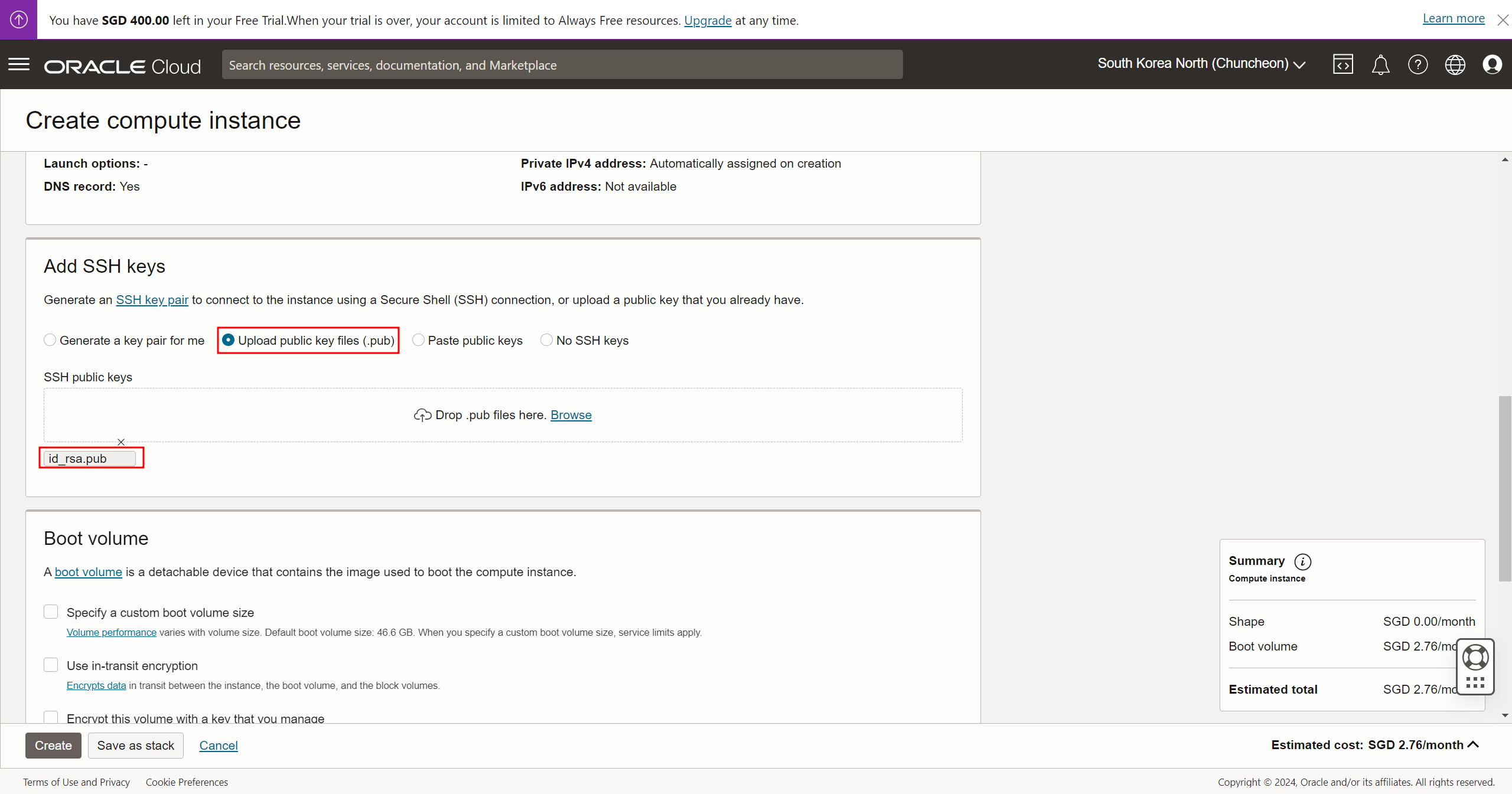 Upload public key files (.pub) 선택 후 생성한 SSH 퍼블릭 키(.pub) 업로드