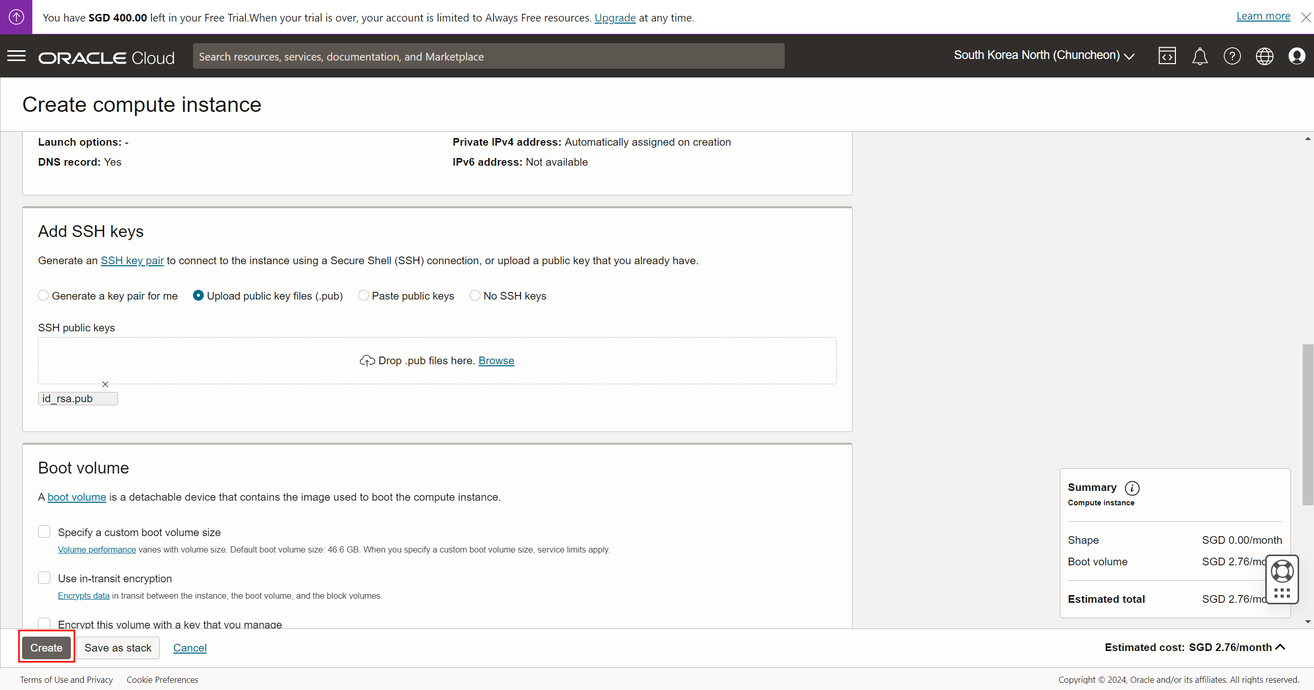 (하단의 부트 볼륨을 지정하지 않으면 기본값으로 46.6GB 부트 볼륨 크기의 가상 머신이 생성된다)