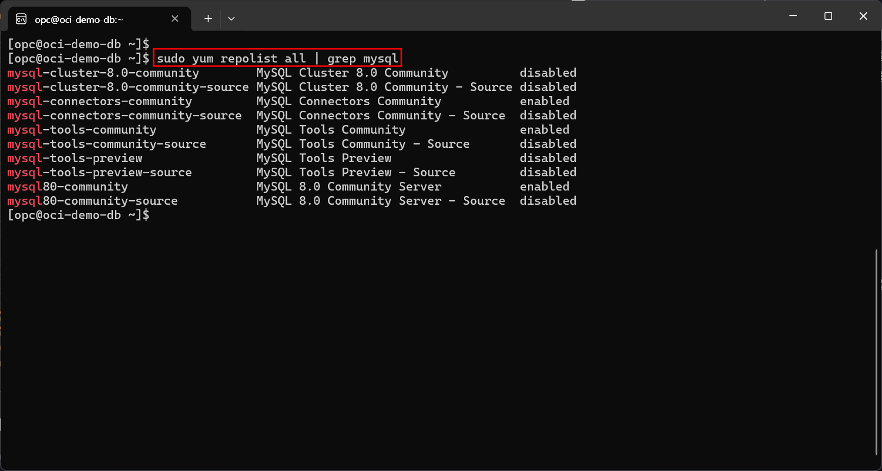 | sudo yum repolist all | grep mysql |