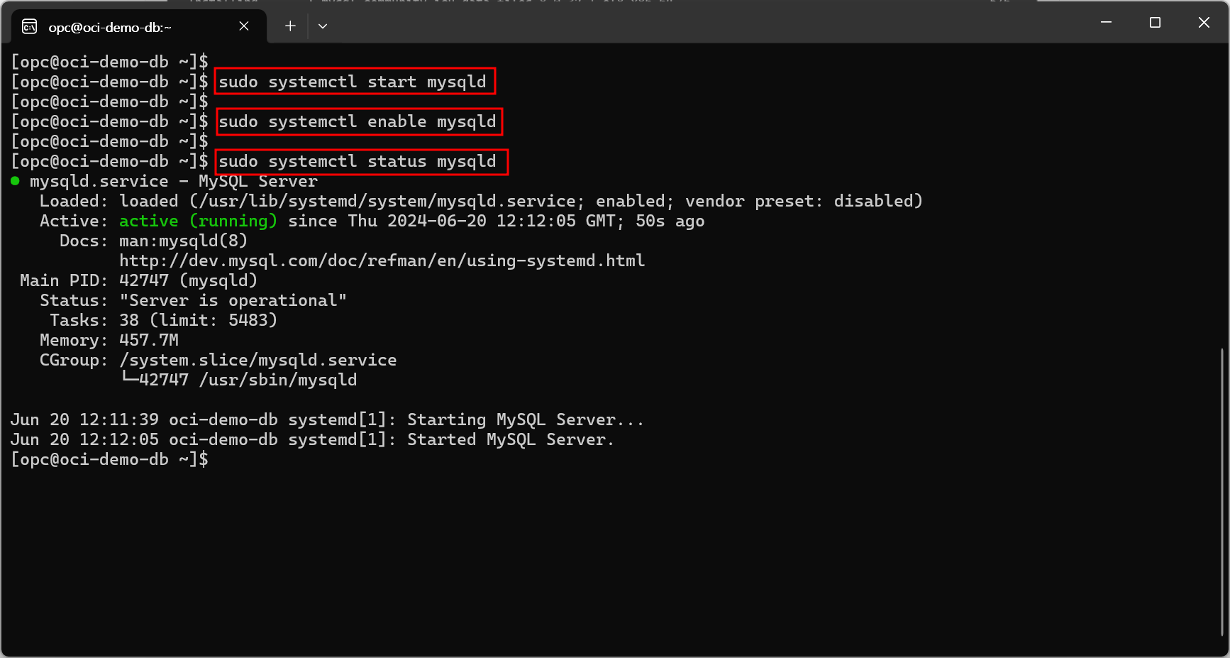 | sudo systemctl start mysqld sudo systemctl enable mysqld sudo systemctl status mysqld |