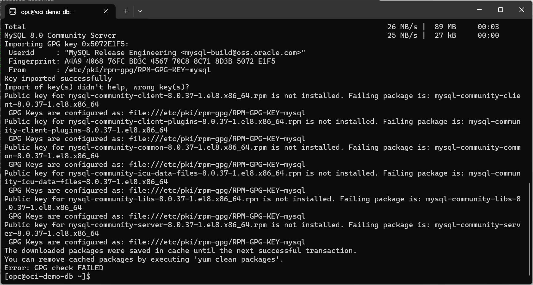 MySQL 패키지가 제공한 GPG 키와 일치하지 않아서 발생하는 에러이다.