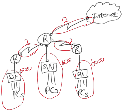 - 라우터 네트워크 구간은 각 장비 인터페이스의 IP만 있으면 되니까 2개씩만 주면 됨(5000, 4000, 6000개의 호스트를 기준으로 나눈 서브넷을 그냥 주기에는 낭비가 심함)