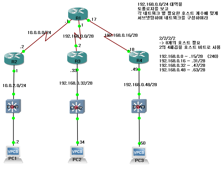 192.168.0.0/24 대역을 토폴로지를 보고 각 네트워크 별 필요한 호스트 개수에 맞게 서브넷팅하여 네트워크를 구성하여라