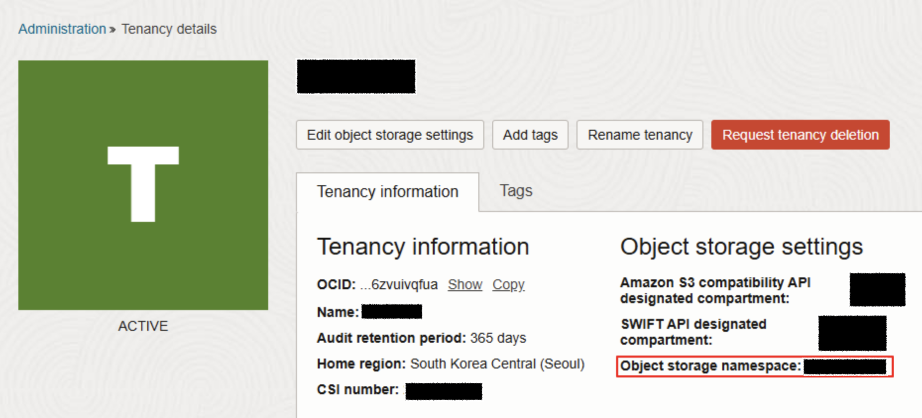 ## 테넌시의 Object Storage namespace 출력