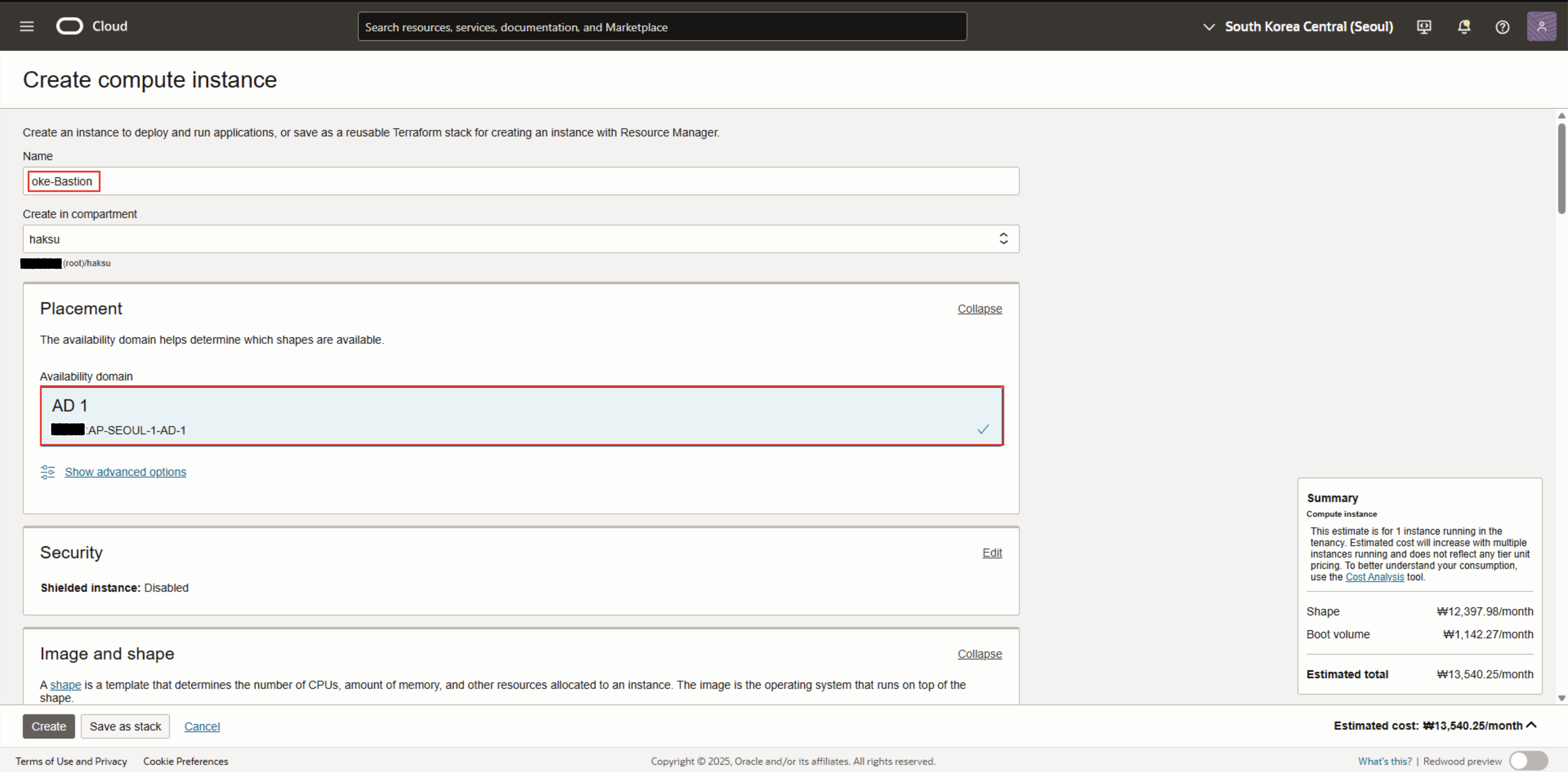 2. Availability domain : <사용 중인 AD 선택>